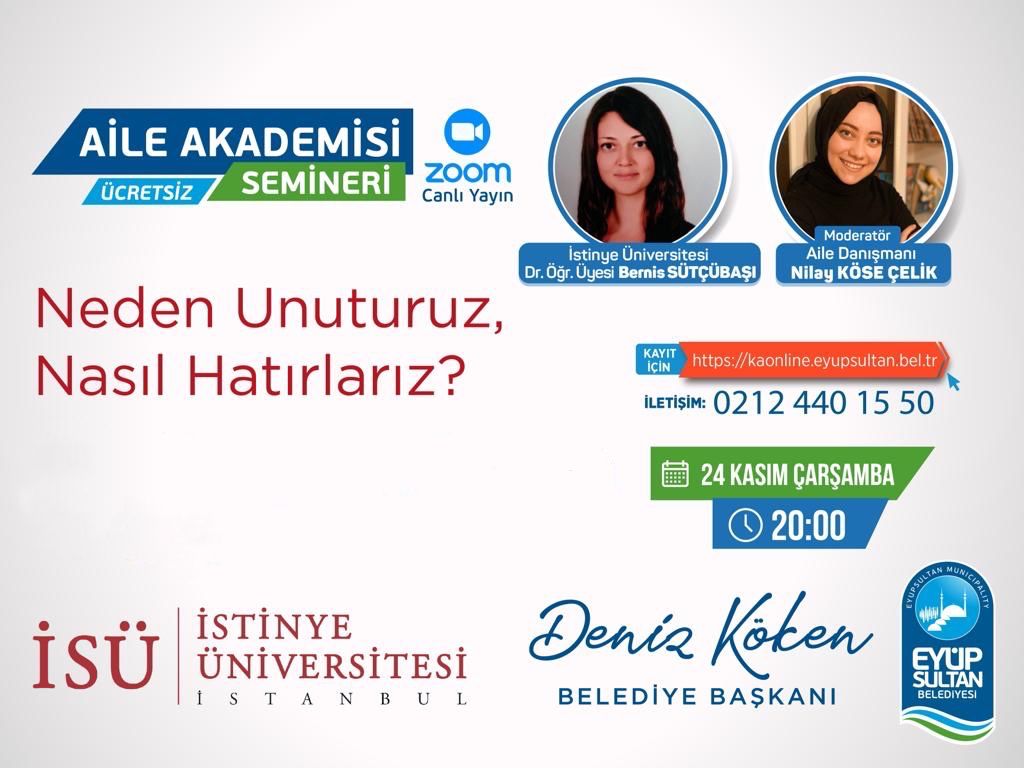 Psikoloji Türkçe Bölüm Başkanı Dr. Öğr. Üyesi Bernis Sütçübaşı, 24 Kasım Çarşamba günü "Neden Unuturuz, Nasıl Hatırlarız?" konulu semineri gerçekleştirdi. Etkinlik İstinye Üniversitesi Psikoloji Bölümü ile Eyüp Belediyesi işbirliği ile Aile Akademisi Seminer dizisi kapsamında düzenlendi.