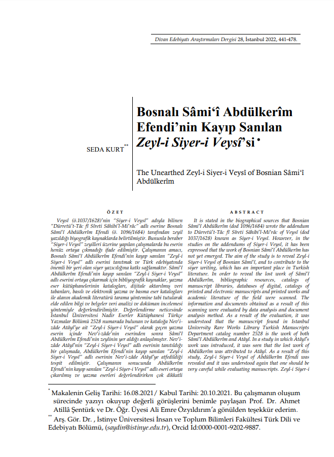 Arş. Gör. Dr. Seda Kurt'un "Bosnalı Sâmi‘î Abdülkerîm Efendi’nin Kayıp Sanılan Zeyl-i Siyer-i Veysî’si" başlıklı makalesi Divan Edebiyatı Araştırmaları Dergisi'nin 28. sayısında yayımlandı. Makalenin tam metnine verilen bağlantıdan ulaşabilirsiniz: https://www.devdergisi.com/
