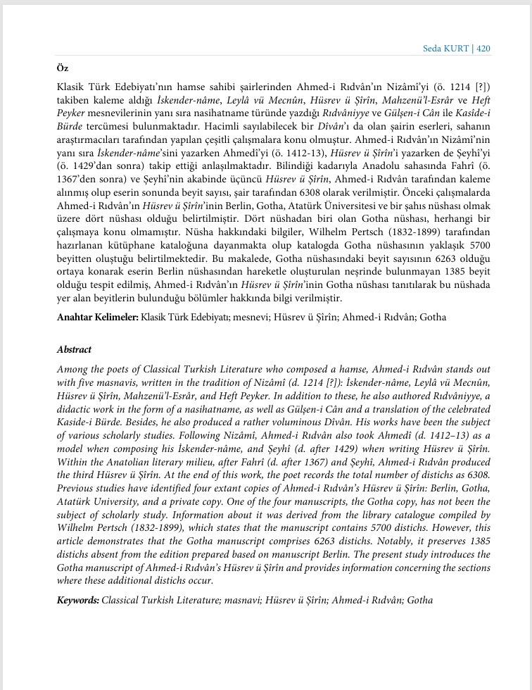 Dr. Öğr. Üyesi Seda Kurt'un TÜBİTAK 2219 Yurt Dışı Doktora Sonrası Araştırma Burs Programı kapsamında desteklenen “Osmanlı Edebiyatında Erken Modern Dönem Edebî Tercüme ve Şerh Metinleri” başlıklı projesi çerçevesinde yazılan "Ahmed-i Rıdvân’ın Hüsrev ü Şîrîn’inin Gotha Nüshasına Dair" başlıklı makalesi yayımlandı.