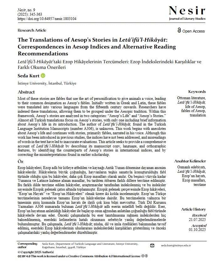 Türk Dili ve Edebiyatı Bölümü Dr. Öğr. Üyesi Seda Kurt'un The Translations of Aesop’s Stories in Letâ’ifü’l-Hikâyât: Correspondences in Aesop Indices and Alternative Reading Recommendations adlı makalesi Nesir dergisinin Ekim 2025 tarihli 9. sayısında yayımlandı. Makaleye bu bağlantıdan erişilebilmektedir: