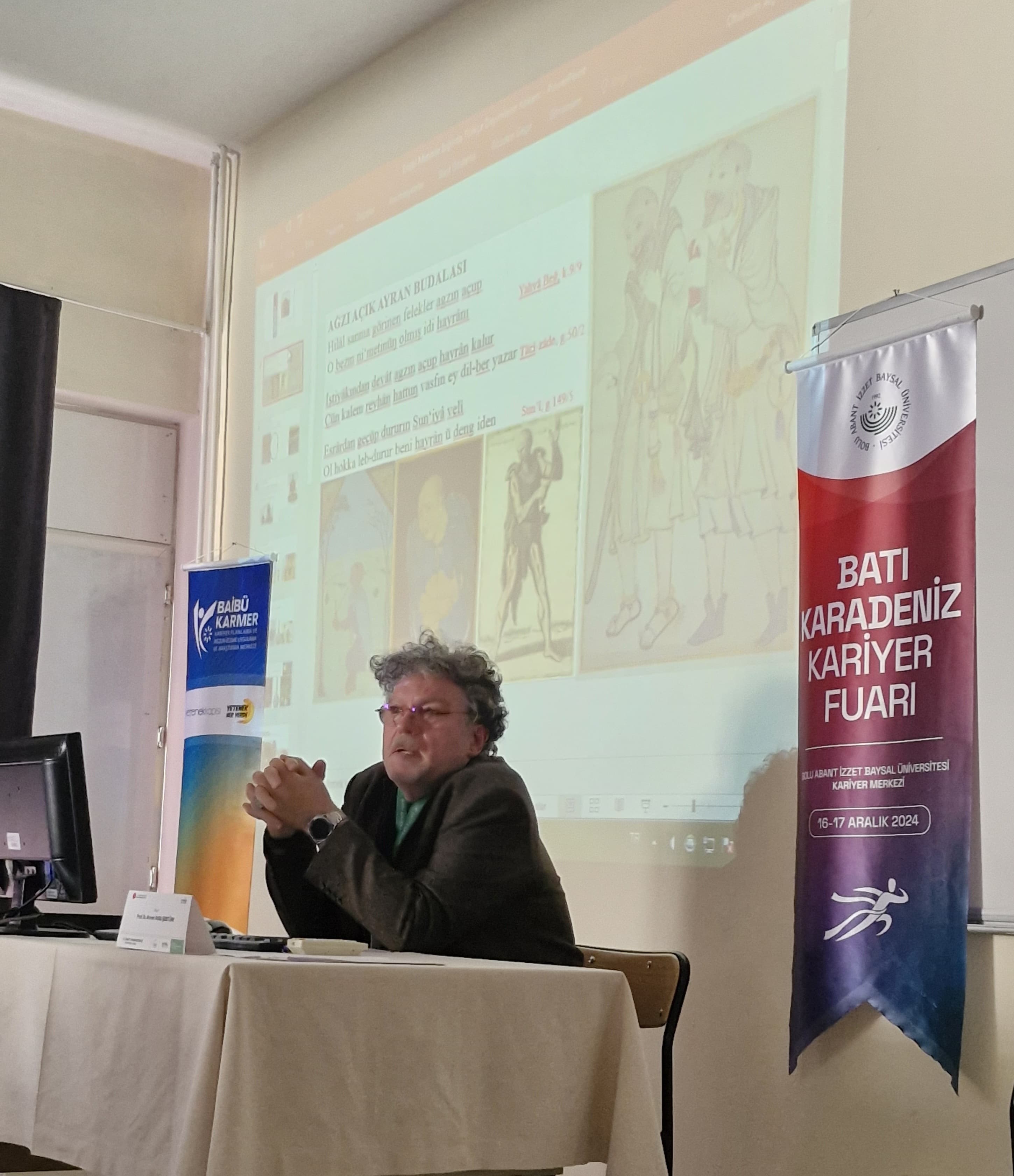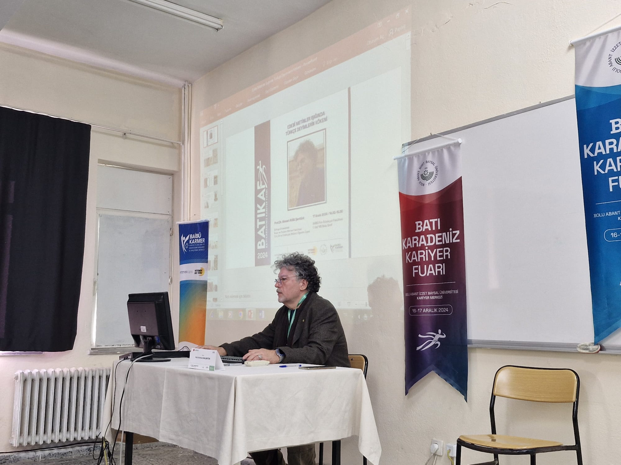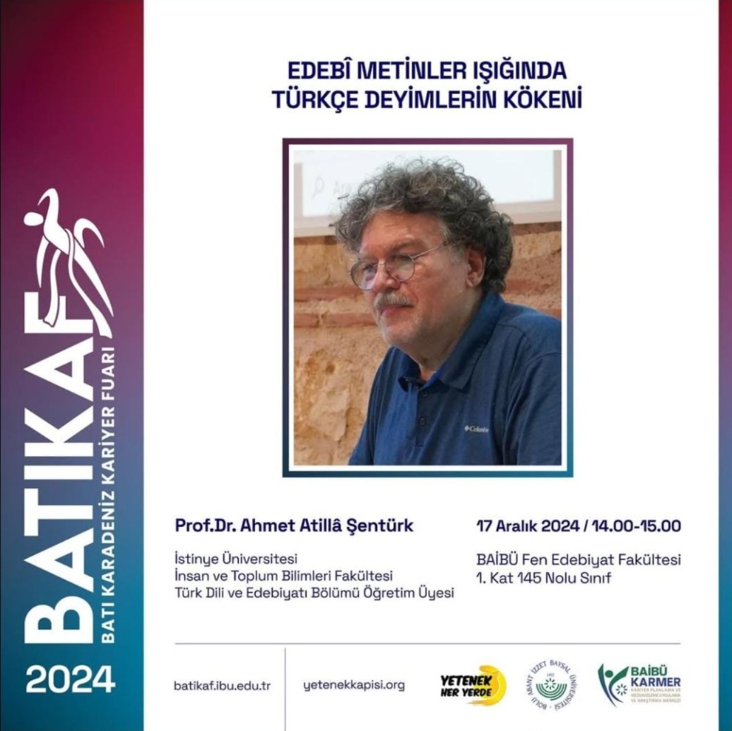 Türk Dili ve Edebiyatı Bölümü Öğretim Üyesi Prof. Dr. Ahmet Atillâ ŞENTÜRK, 16-17 Aralık 2024 tarihlerinde Türkiye Cumhuriyeti Cumhurbaşkanlığı İnsan Kaynakları Ofisinin koordinatörlüğünde ve Bolu Abant İzzet Baysal Üniversitesinin ev sahipliğinde düzenlenen "Batı Karadeniz Kariyer Fuarı (BATIKAF) 2024" kapsamında "Edebî Metinler Işığında Türkçe Deyimlerin Kökeni" başlıklı etkinliğe davetli konuşmacı olarak katıldı.