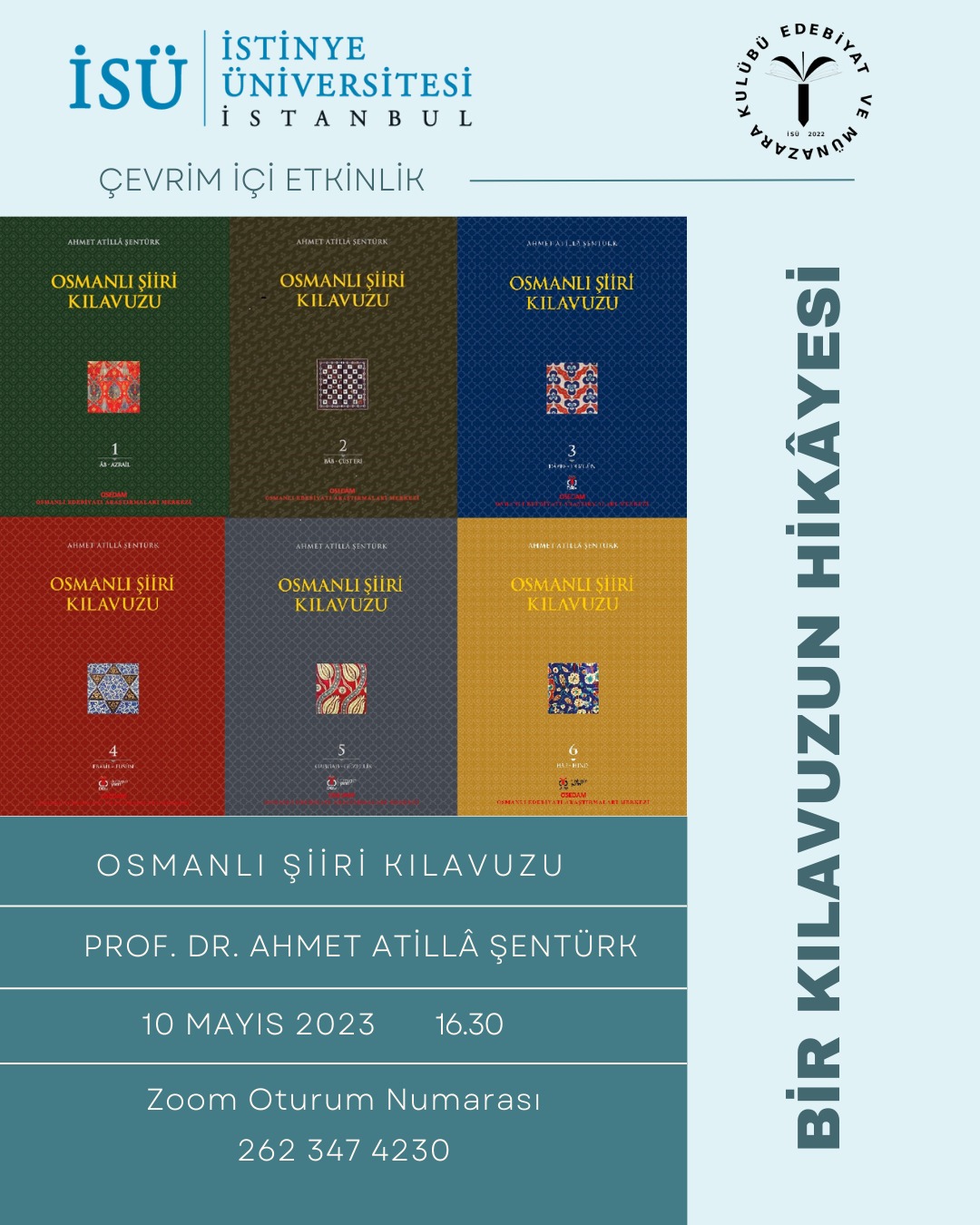 İnsan ve Toplum Bilimleri Fakültesi Türk Dili ve Edebiyatı Bölümü Öğretim Üyesi Prof. Dr. Ahmet Atillâ Şentürk, İstinye Üniversitesi öğrenci kulüplerinden Edebiyat ve Münazara Kulübü'nün çevrim içi etkinlikleri kapsamında ''Bir Kılavuzun Hikâyesi'' başlıklı etkinliğe konuk olacak. 10 Mayıs 2023 Çarşamba günü saat 16.30'da başlayacak etkinlikte, her yıl bir cildi yayımlanan ve şimdiye kadar altı cildi tamamlanan Osmanlı Şiiri Kılavuzu'nun hazırlanma ve yayımlanma süreci anlatılacak.