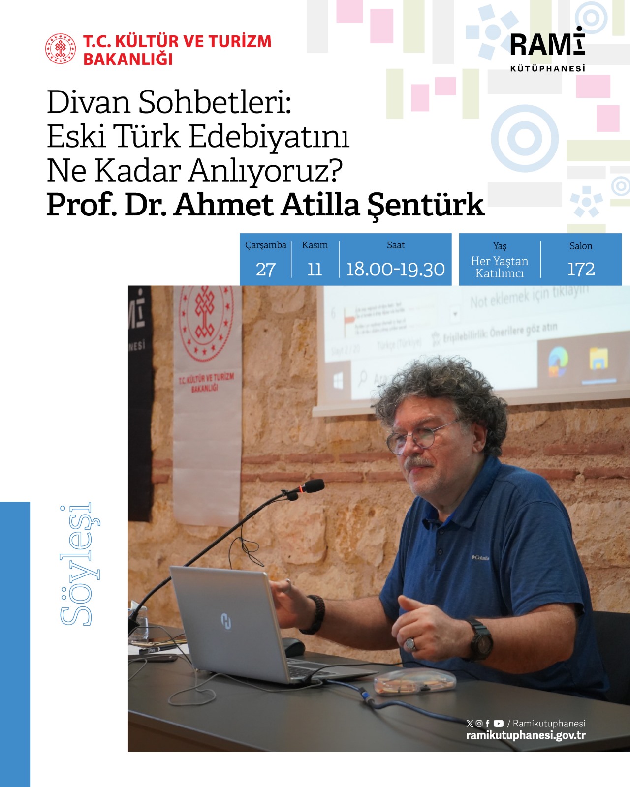 Türk Dili ve Edebiyatı Bölümü Öğretim Üyesi Prof. Dr. Ahmet Atillâ ŞENTÜRK'ün konuşmacı olduğu ''Divan Sohbetleri'' söyleşi serisi Rami Kütüphanesinde devam ediyor. 27 Kasım 2024 Çarşamba günü gerçekleştirilecek olan söyleşinin konu başlığı "Eski Türk Edebiyatını Ne Kadar Anlıyoruz?" şeklindedir.