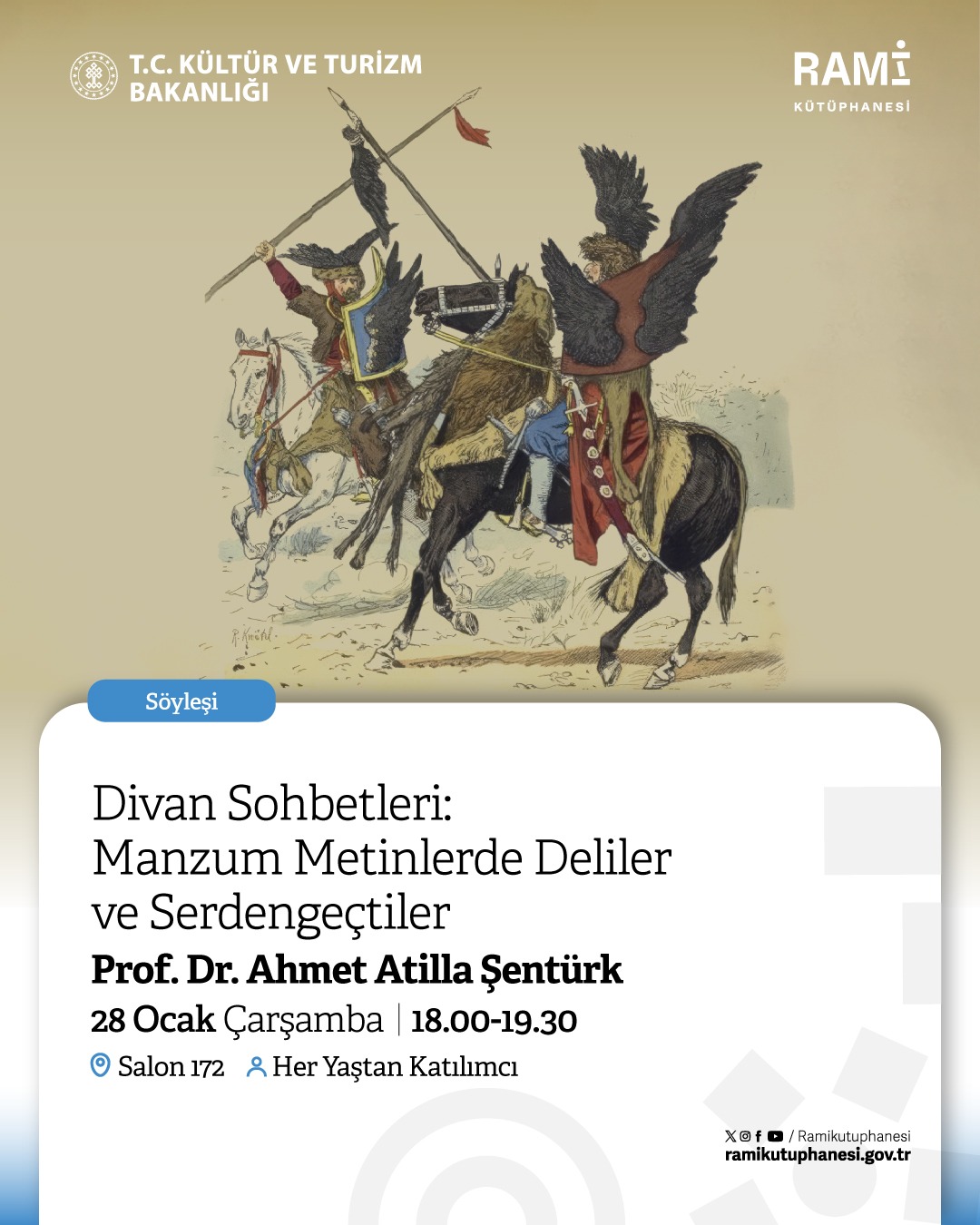 Türk Dili ve Edebiyatı Bölümü Öğretim Üyesi Prof. Dr. Ahmet Atillâ Şentürk ile Rami Kütüphanesinde düzenlenen "Divan Sohbetleri" söyleşi serisi devam ediyor. 28 Ocak 2026 Çarşamba günü 18.00–19.30 saatleri arasında gerçekleştirilecek olan söyleşinin konu başlığı "Manzum Metinlerde Deliler ve Serdengeçtiler" şeklindedir.