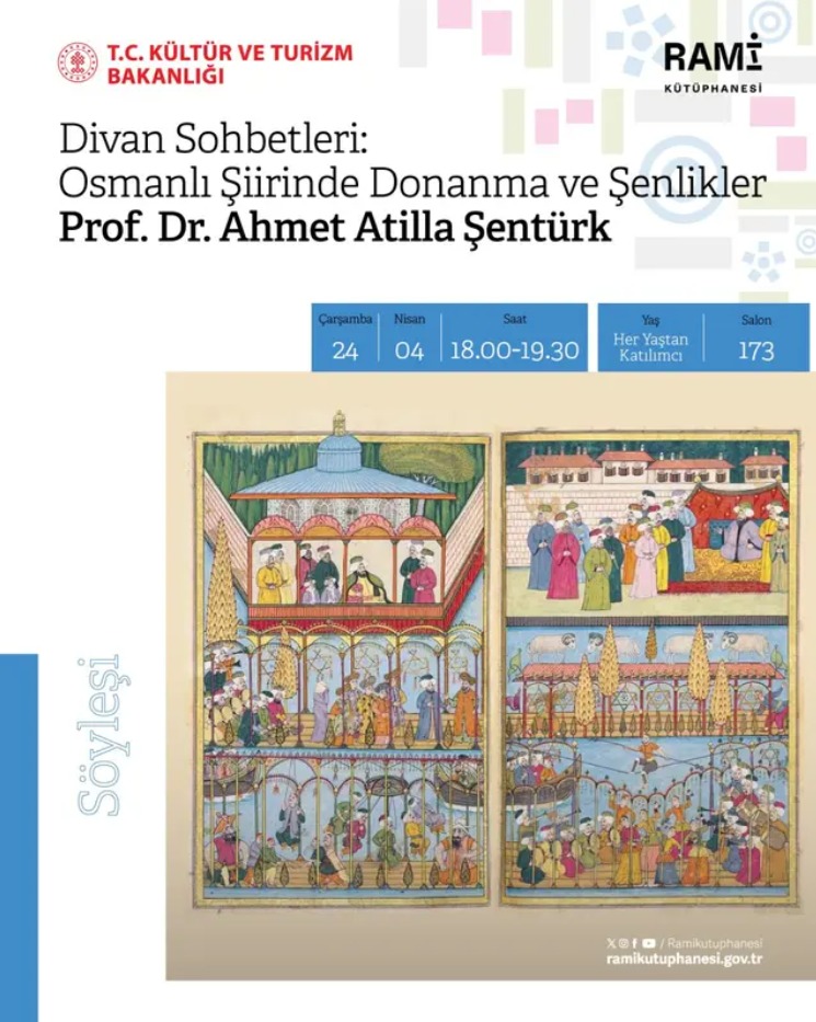 Türk Dili ve Edebiyatı Bölümü Öğretim Üyesi Prof. Dr. Ahmet Atillâ ŞENTÜRK ile Rami Kütüphanesinde her ay bir defa düzenlenen ''Divan Sohbetleri'' söyleşi serisi devam ediyor. 24 Nisan 2024 Çarşamba günü gerçekleştirilecek olan söyleşinin konu başlığı ''Osmanlı Şiirinde Donanma ve Şenlikler'' şeklindedir.