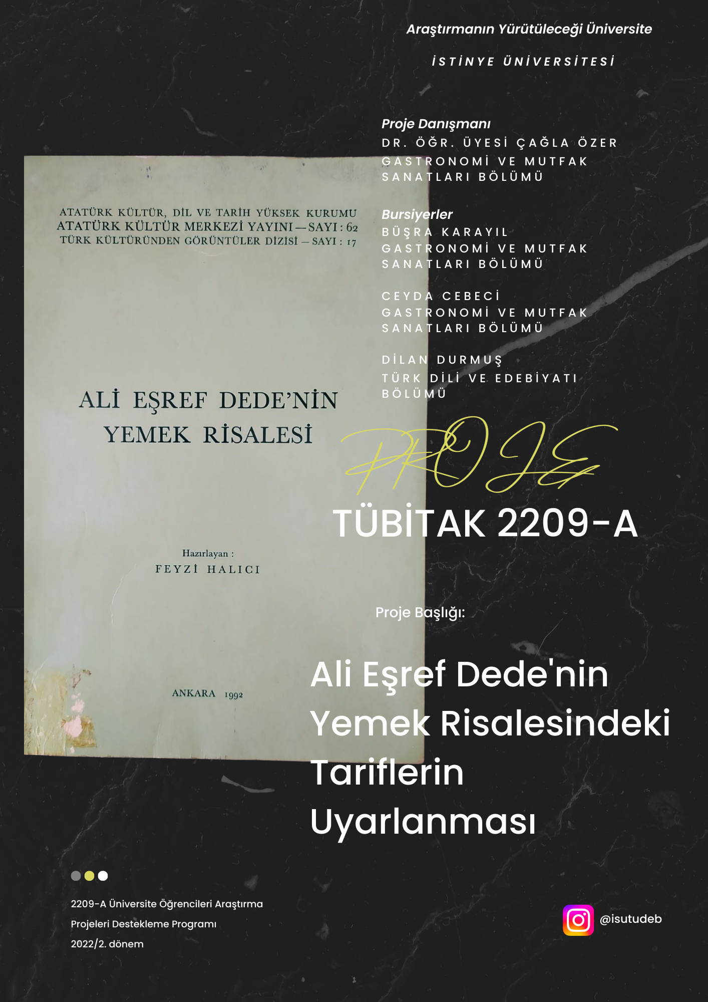 İnsan ve Toplum Bilimleri Fakültesi Türk Dili ve Edebiyatı Bölümü Lisans öğrencisi Dilan Durmuş'un bursiyerler arasında bulunduğu ''Ali Eşref Dede'nin Yemek Risalesindeki Tariflerin Uyarlanması'' başlıklı proje, TÜBİTAK 2209-A - Üniversite Öğrencileri Araştırma Projeleri Destekleme Programı kapsamında destek hakkı kazanmıştır. Proje danışmanı, İstinye Üniversitesi Güzel Sanatlar, Tasarım ve Mimarlık Fakültesi Gastronomi ve Mutfak Sanatları Bölüm Başkanı Dr. Öğr. Üyesi Çağla Özer'dir.