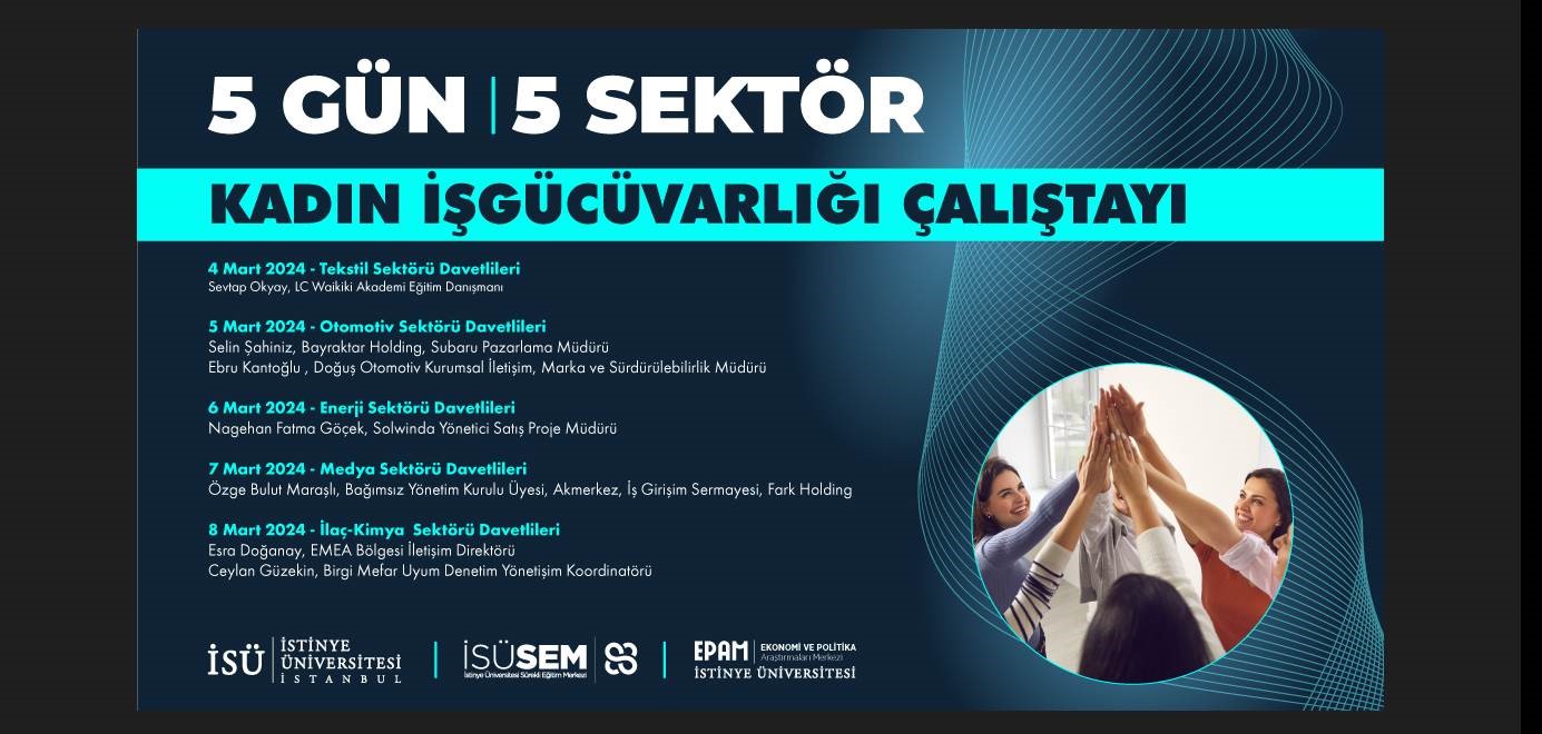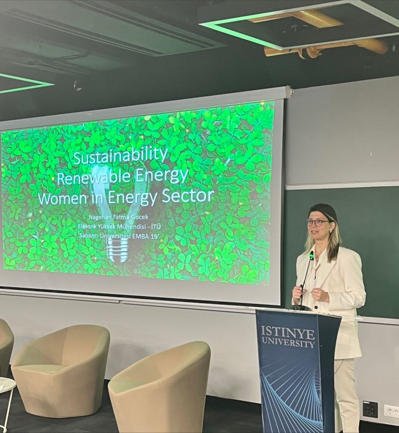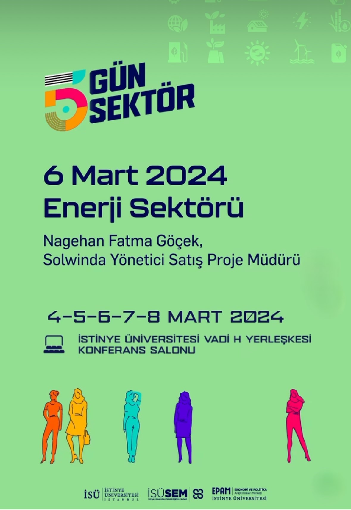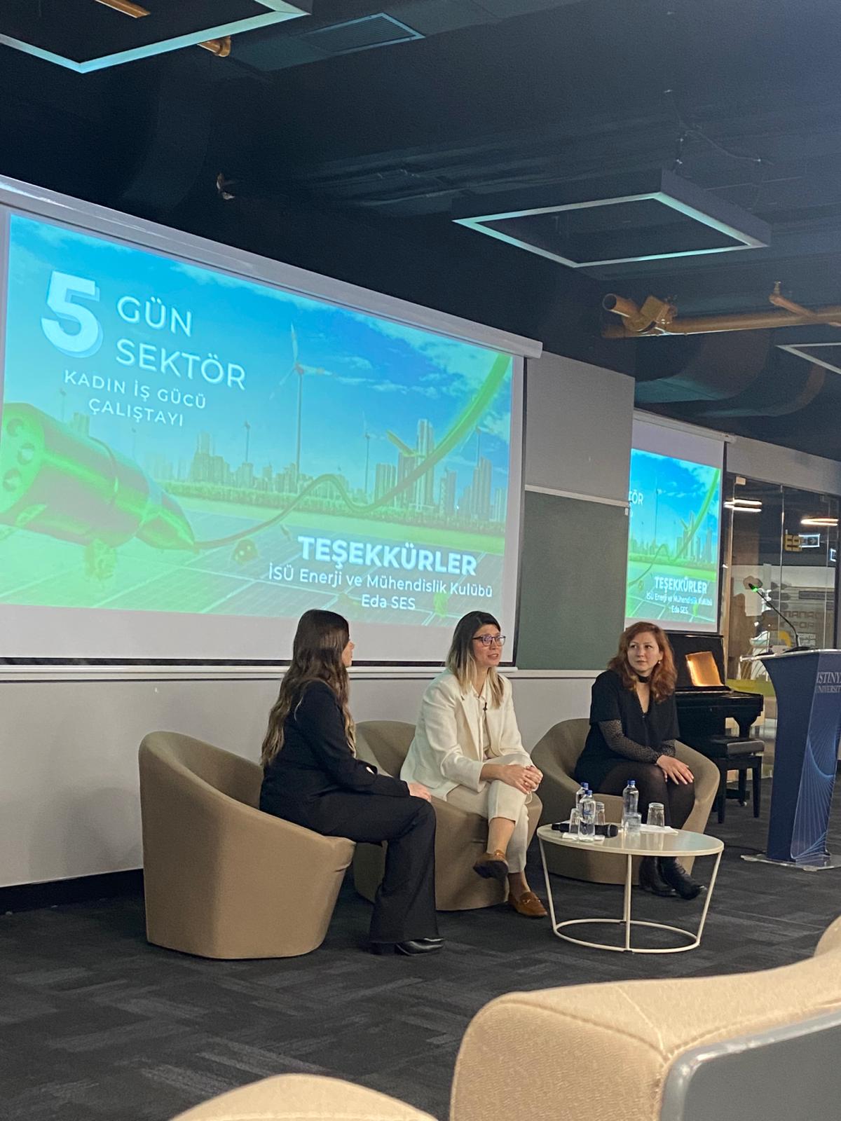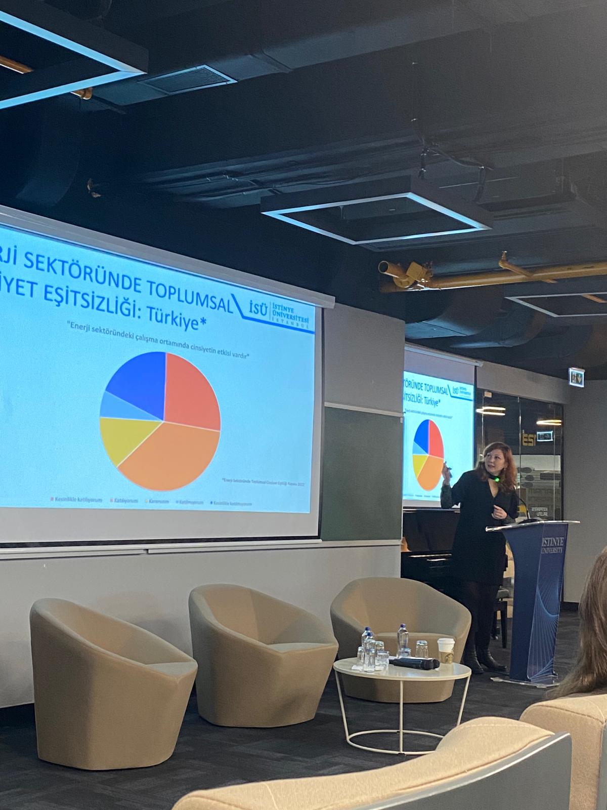 İstinye Üniversitesi'nde gerçekleştirilen 5 gün 5 Sektör Kadın İşgücü Çalıştayı'nın Enerji sektörüne odaklanan, Solwinda Yönetici Satış Proje Müdürü Nagehan Fatma Göçek'in konuk olduğu 6 Mart 2024 oturumunda, İTBF Dekan yardımcısı ve Sosyoloji Bölüm başkanı Selen Yanmaz cinsiyet eşitsizliği ve sürdürülebilirlik konusunda bir sunum yaptı.