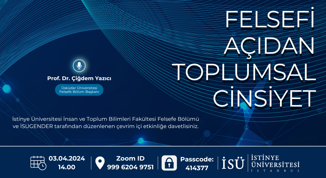 Felsefe bölümü adına Bölüm Başkanı Dr. Öğr. Üyesi İbrahim Eylem Doğan ve İSUGENDER Toplumsal Cinsiyet ve Kadın Çalışmaları Merkezi adına merkez müdürü Dr. Öğr. Üyesi Selen Yanmaz'ın ev sahipliğinde 3 Nisan 2024'te gerçekleştirilen etkinlikte Üsküdar Üniversitesi Felsefe Bölüm Başkanı Prof. Dr. Çiğdem Yazıcı "Felsefi Açıdan Toplumsal Cinsiyet" başlıklı bir sunum yapmıştır.