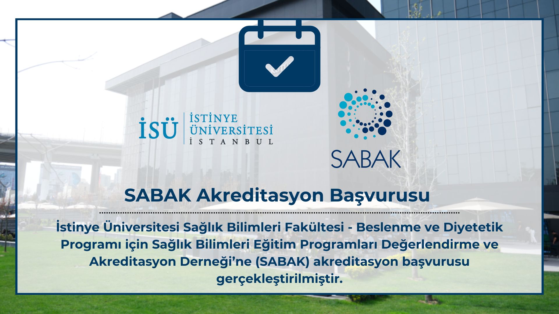 İstinye Üniversitesi Sağlık Bilimleri Fakültesi bünyesinde yer alan Beslenme ve Diyetetik Programı, akademik mükemmeliyet hedefi doğrultusunda Sağlık Bilimleri Eğitim Programları Değerlendirme ve Akreditasyon Derneği (SABAK)’a akreditasyon başvurusunda bulunmuştur.