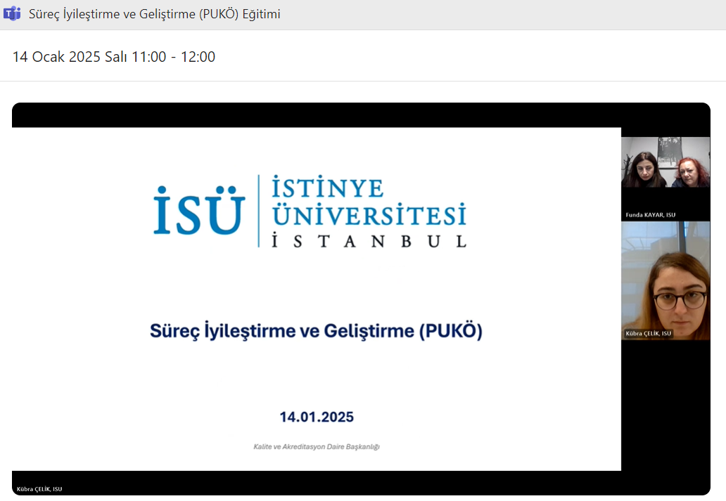 İSÜ Kalite ve Akreditasyon Daire Başkanlığı tarafından, kalite yönetimi ve süreç iyileştirme çalışmalarına verdiği önemi bir kez daha vurgulayarak idari personele yönelik "Süreç İyileştirme ve Geliştirme (PUKÖ)" eğitimleri planlanmıştır. Bu kapsamda, eğitim süreci Öğrenci İşleri Daire Başkanlığı personeliyle devam ettirilmiştir. Eğitim, idari personelin süreçlerini daha etkin ve verimli bir şekilde yönetebilmeleri ve sürekli iyileştirme yaklaşımını benimsemeleri için gerekli bilgi ve becerilerin kazandırılmasını hedeflemektedir. Eğitim programının, önümüzdeki dönemde üniversitenin diğer birimlerinde de uygulanmaya devam edilmesi planlanmaktadır.