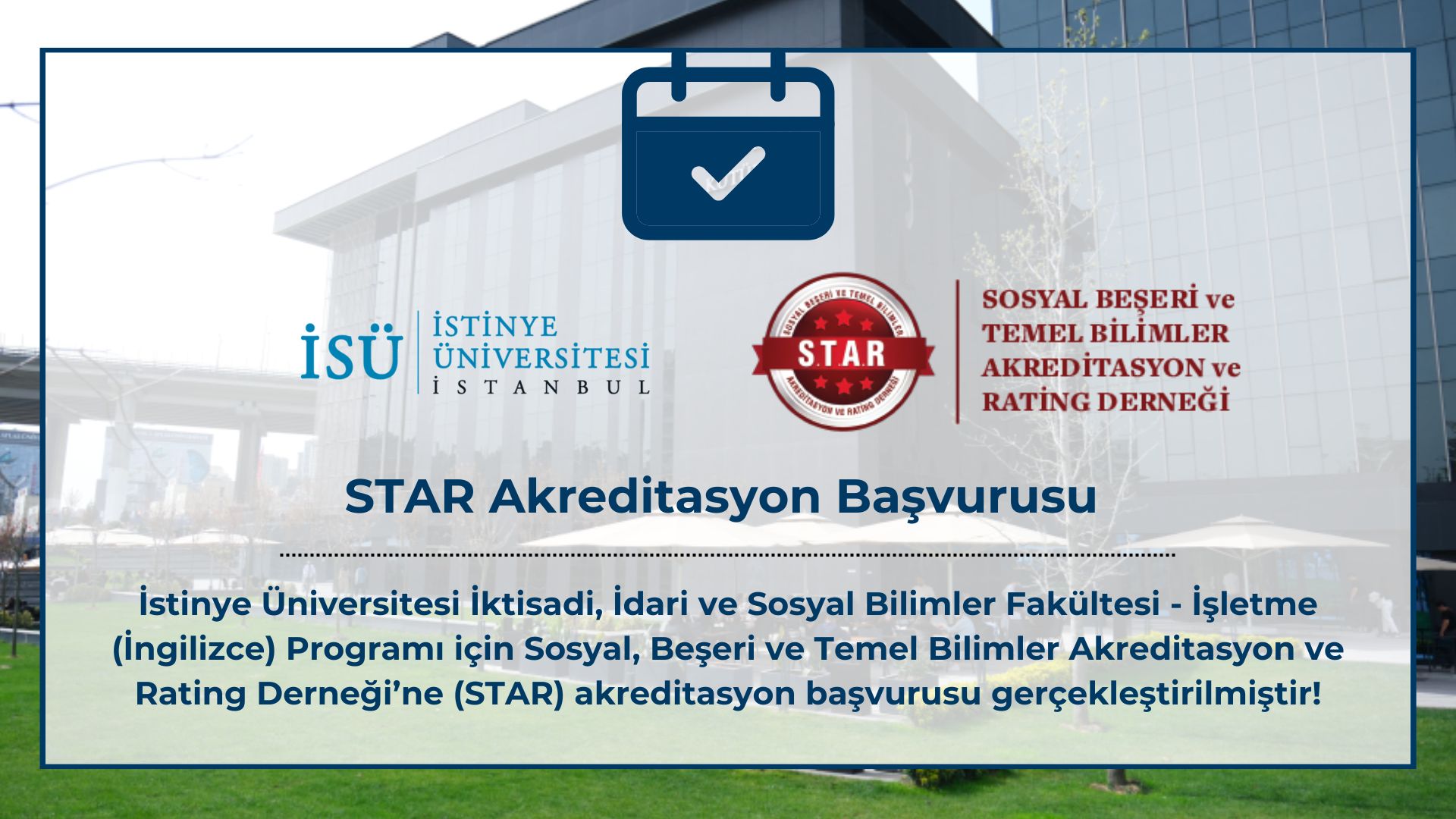 İstinye Üniversitesi İktisadi, İdari ve Sosyal Bilimler Fakültesi, İşletme (İngilizce) Programı için, Sosyal, Beşeri, Temel Bilimler Akreditasyon ve Rating Derneği (STAR)’a akreditasyon başvurusunda bulunarak kalite odaklı eğitim anlayışını bir adım daha ileriye taşımaktadır. Bu kapsamda, STAR tarafından gerçekleştirilecek saha ziyareti öncesinde program, titiz ve kapsamlı bir hazırlık sürecine girmiştir.