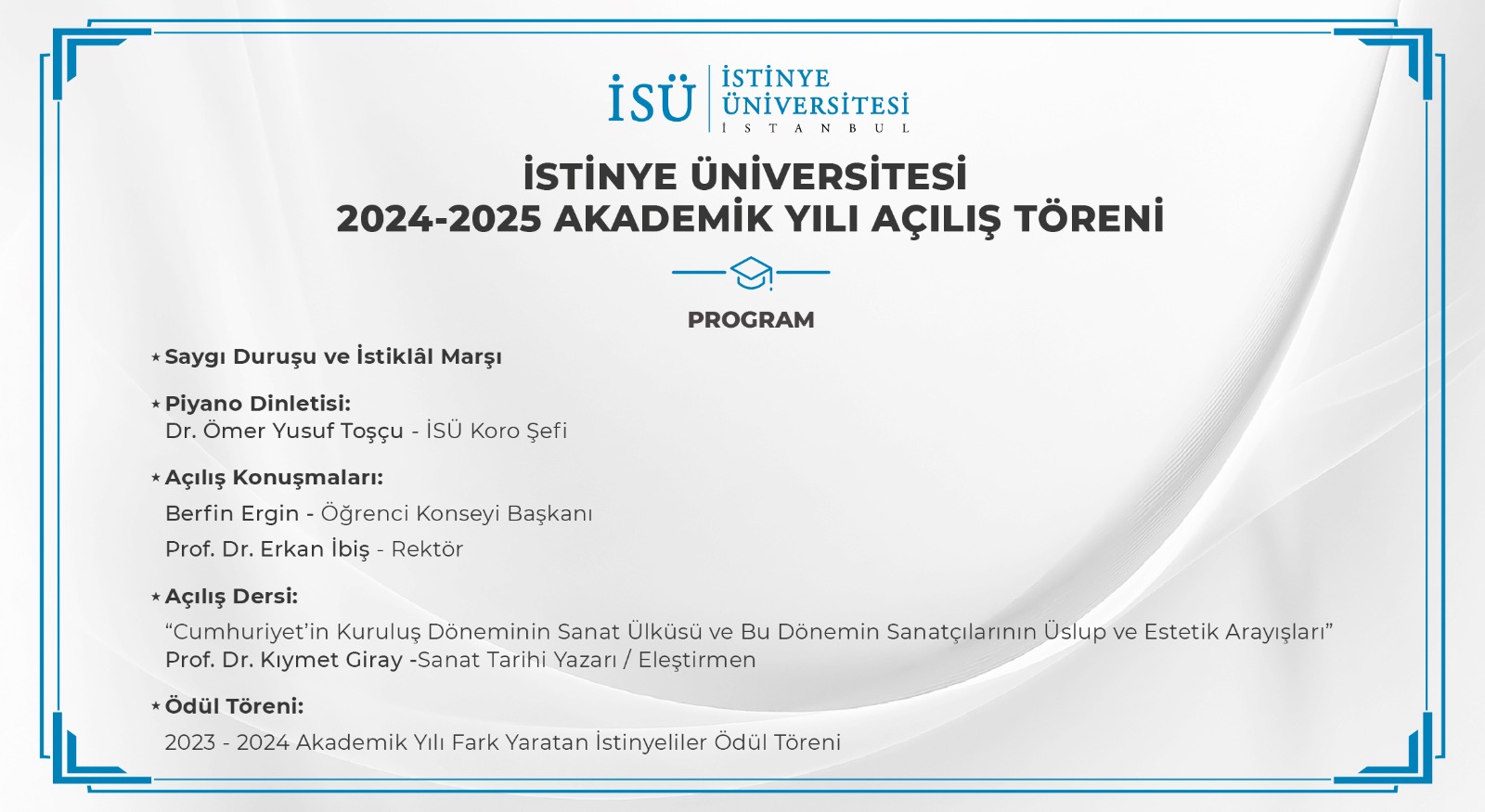 2023 - 2024 Akademik Yılı Açılış Töreni; İstinye Üniversitesi Rektörü Prof. Dr. Erkan İbiş, Sanat Tarih Yazarı Prof. Dr. Kıymet Giray ve İstinye Üniversitesi Akademisyenlerinin katılımıyla 8 Ekim 2024 Salı günü İstinye Üniversitesi Topkapı Kampüsü’nde gerçekleşti.