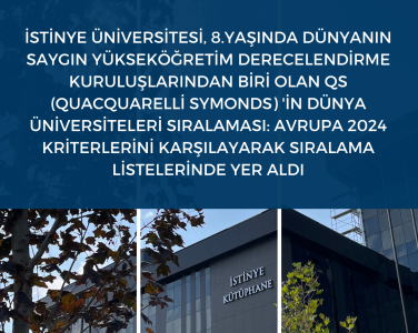 İstinye Üniversitesi, dünyanın saygın yükseköğretim derecelendirme kuruluşlarından biri olan QS (Quacquarelli Symonds) tarafından düzenlenen Dünya Üniversiteleri Sıralaması: Avrupa 2024 kriterlerini başarıyla karşılayarak büyük bir başarı elde etti. Üniversitemiz, bu sıralamada yer alarak Türkiye'nin eğitim kalitesini uluslararası platformda bir kez daha kanıtladı.