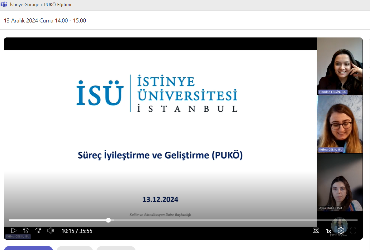 İSÜ Kalite ve Akreditasyon Daire Başkanlığı tarafından, kalite yönetimi ve süreç iyileştirme çalışmalarına verdiği önemi bir kez daha vurgulayarak idari personele yönelik "Süreç İyileştirme ve Geliştirme (PUKÖ)" eğitimleri planlanmıştır. Eğitim, ilk olarak Girişimcilik ve Kuluçka Merkezi çalışanlarıyla başlatılmış olup, önümüzdeki dönemde diğer birimlerde de devam edecektir. Eğitim, idari personelimizin süreçlerini daha verimli hale getirebilmesi ve iyileştirebilmesi için gerekli bilgi ve becerileri kazandırmayı amaçlamaktadır.