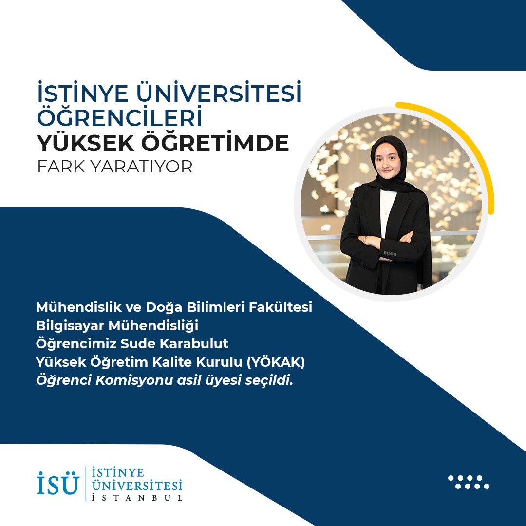 İstinye Üniversitesi Mühendislik ve Doğa Bilimleri Fakültesi Bilgisayar Mühendisliği programında öğrenim gören ve üniversitemiz Kalite Topluluğu başkanlığını yürüten Sude KARABULUT, Yükseköğretim Kalite Kurulu (YÖKAK) Öğrenci Komisyonuna asil üye olarak seçildi.