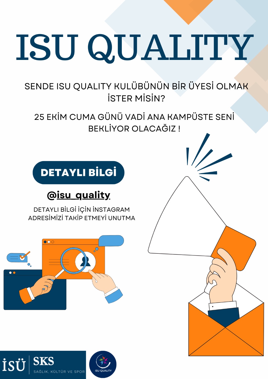 Öğrencilerimizin kalite süreçlerine katılımlarını artırmak amacıyla kurulan ISU Quality Kulübümüz 25 Ekim Cuma günü siz değerli öğrencilerimiz ile buluşacaktır.