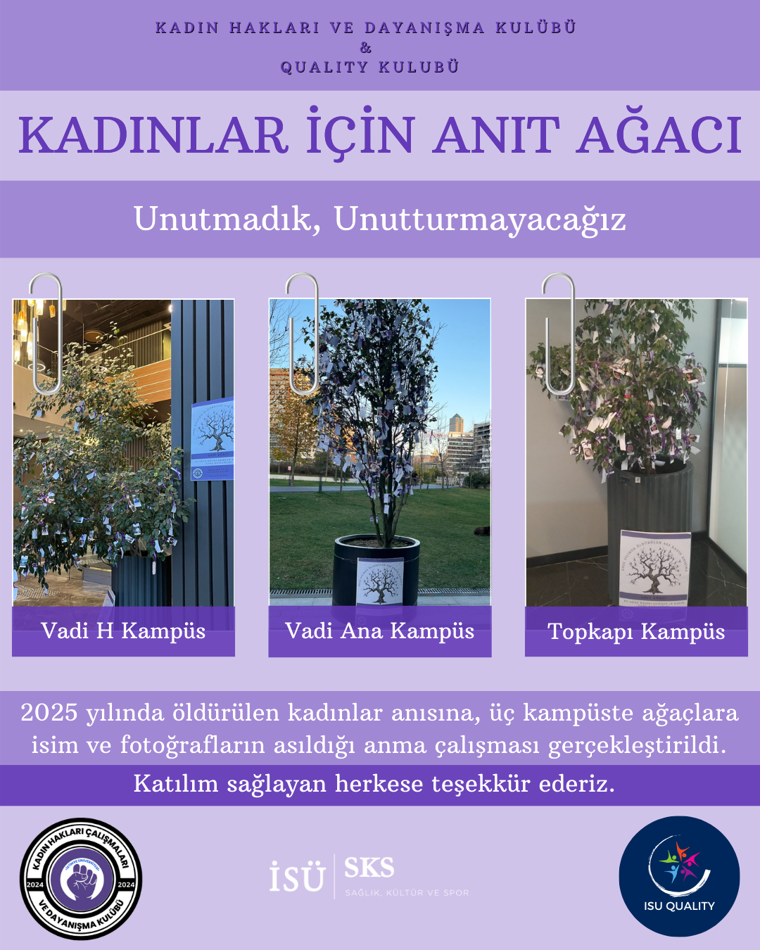 ISU QUALITY Kulübü ile Kadın Hakları ve Dayanışma Kulübü, 2025 yılında şiddet sonucu hayatını kaybeden kadınların anısını yaşatmak ve toplumsal farkındalık oluşturmak amacıyla üç kampüste ortak bir anma etkinliği gerçekleştirdi.