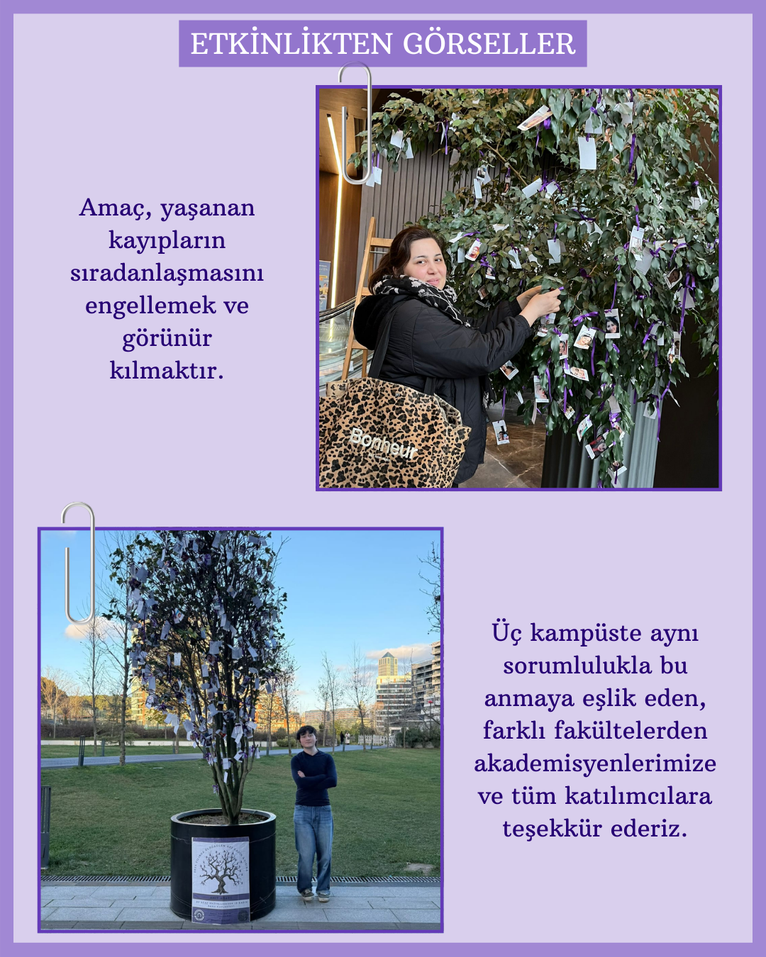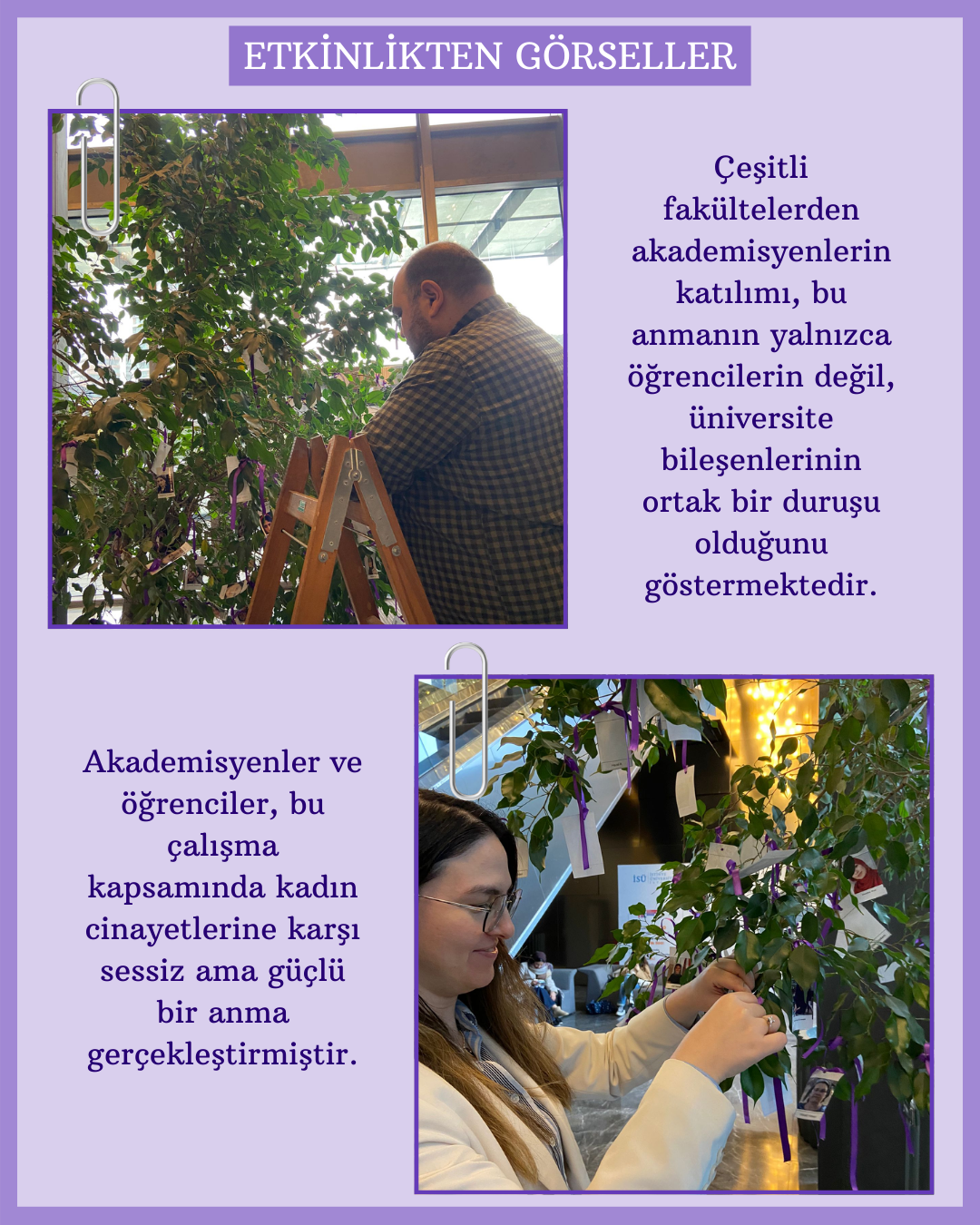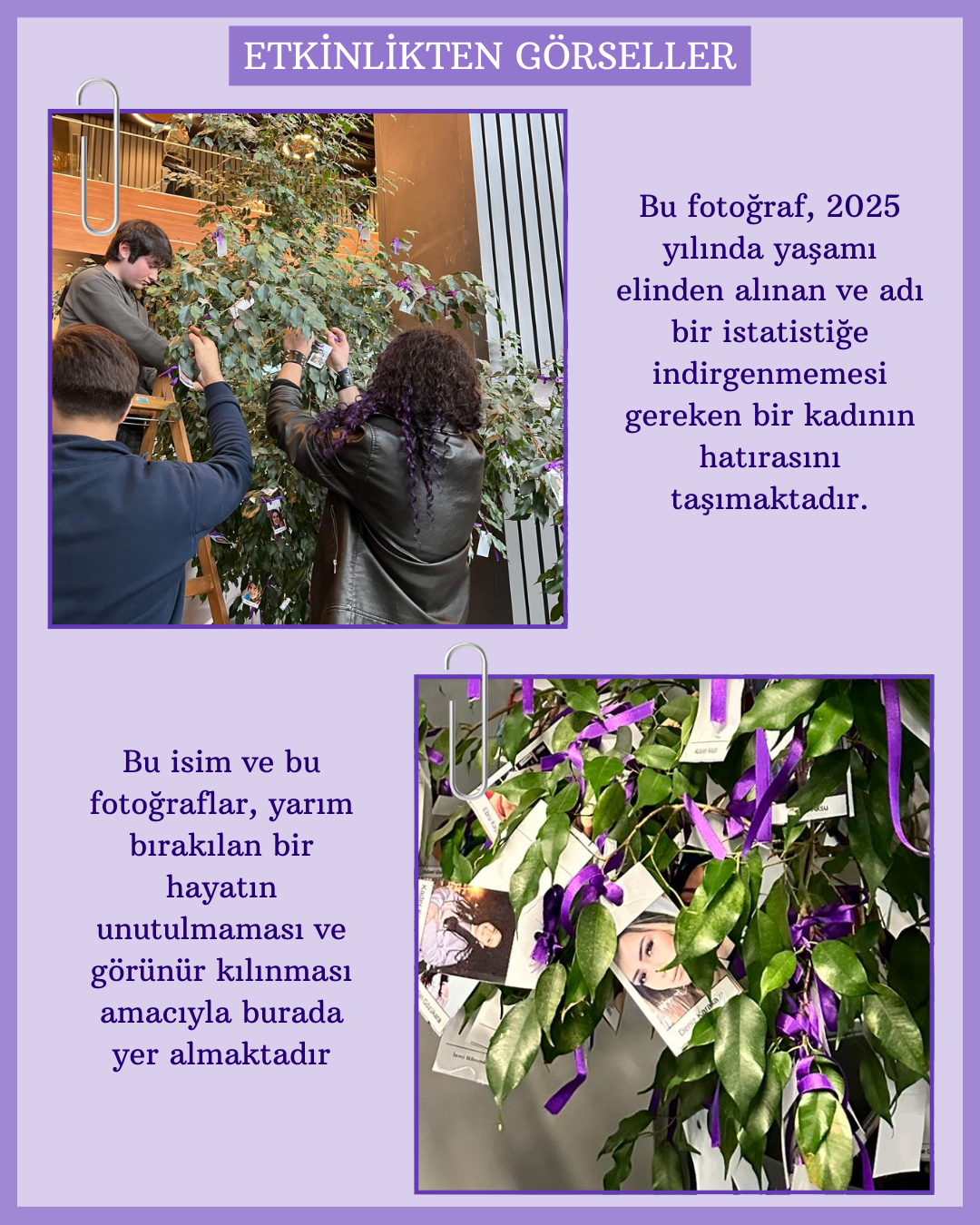 Üç farklı kampüste düzenlenen anma çalışmasında, 2025 yılında şiddet sonucu hayatını kaybeden kadınların fotoğrafları ağaç dallarına mor kurdelelerle asıldı. Her bir fotoğraf bir yaşamı, her kurdele yarım bırakılmış bir hayatı simgelerken; katılımcılar “Bir Kurdele de Sen Bağla” çağrısıyla dayanışma mesajı verdi.