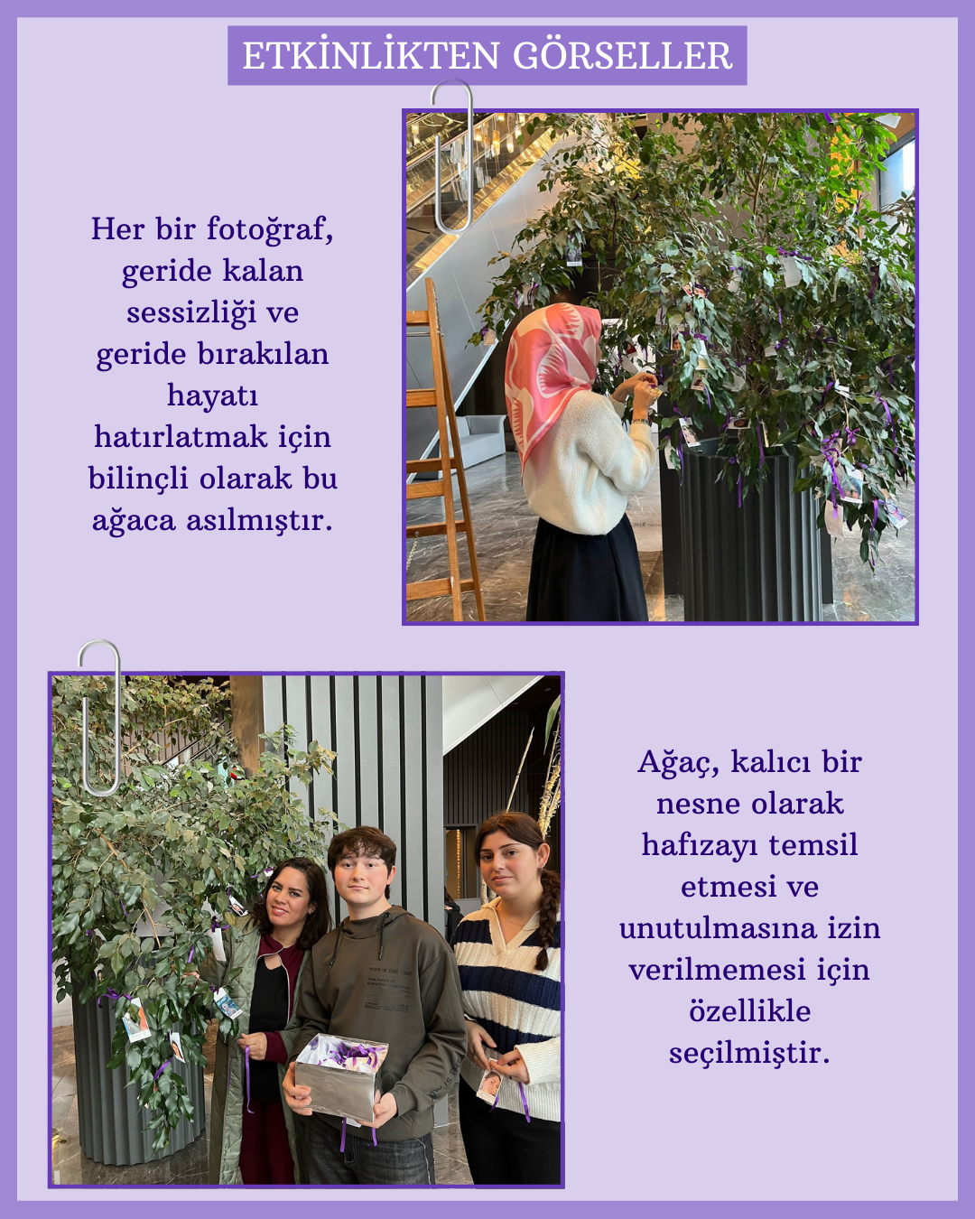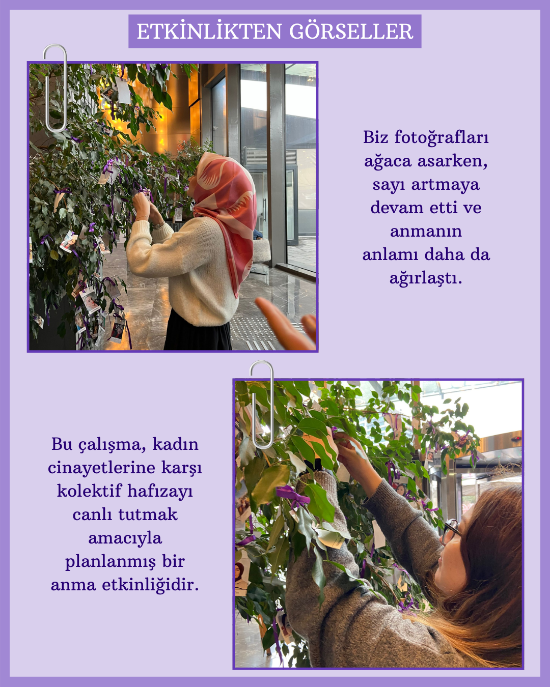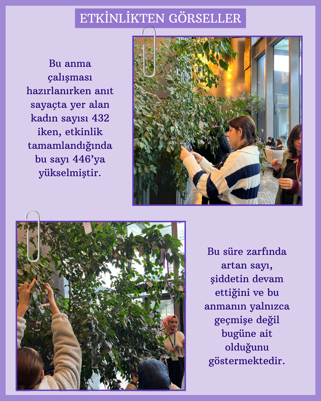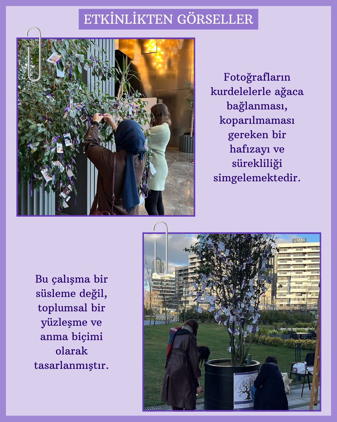 Üç farklı kampüste düzenlenen anma çalışmasında, 2025 yılında şiddet sonucu hayatını kaybeden kadınların fotoğrafları ağaç dallarına mor kurdelelerle asıldı. Her bir fotoğraf bir yaşamı, her kurdele yarım bırakılmış bir hayatı simgelerken; katılımcılar “Bir Kurdele de Sen Bağla” çağrısıyla dayanışma mesajı verdi.