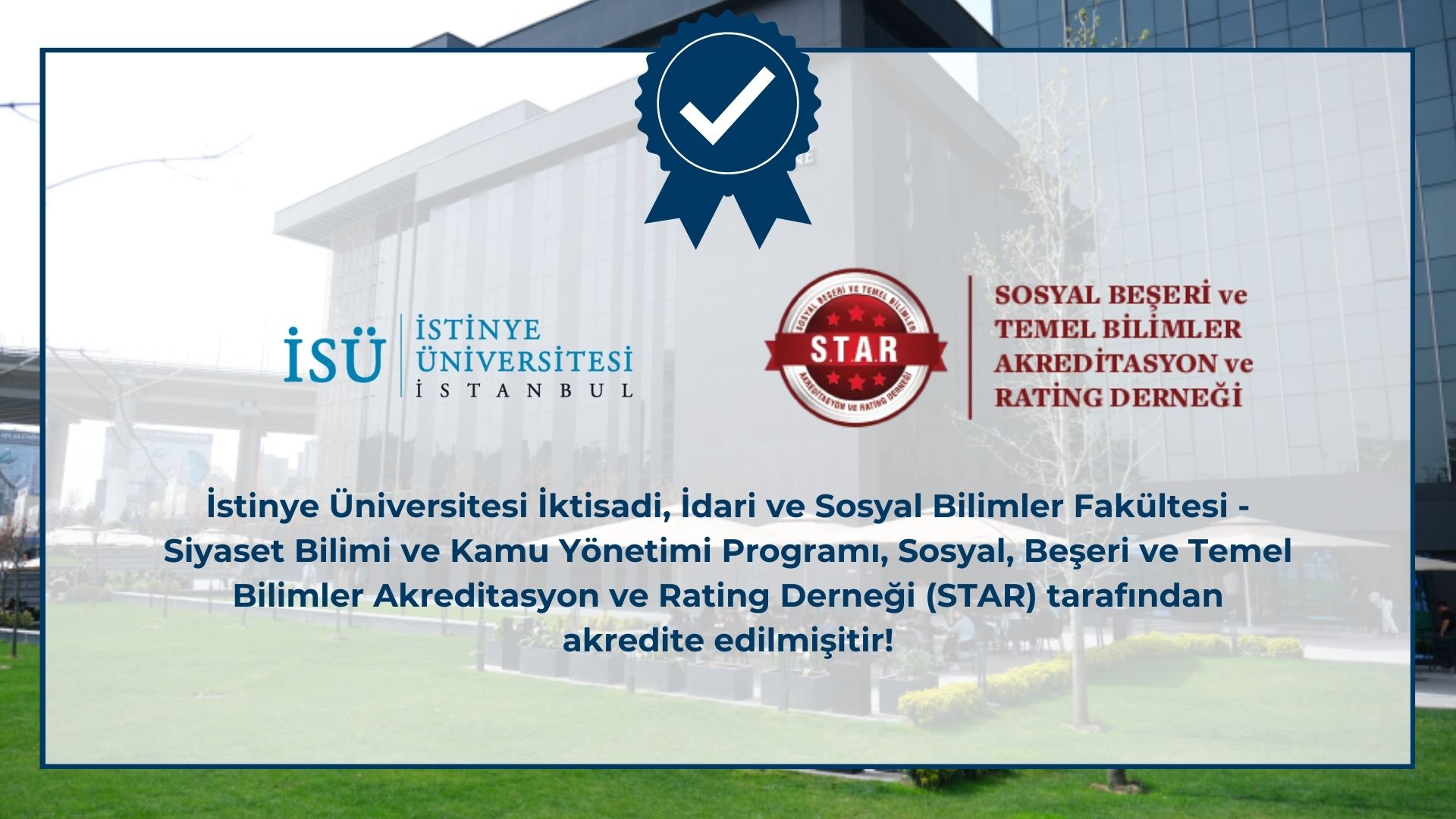 İstinye Üniversitesi İktisadi, İdari ve Sosyal Bilimler Fakültesi bünyesinde yer alan Siyaset Bilimi ve Kamu Yönetimi Programı, Sosyal, Beşeri ve Temel Bilimler Akreditasyon ve Derecelendirme Derneği (STAR) tarafından akredite edilmiştir. Akreditasyon belgesi, İstanbul Gedik Üniversitesi'nin ev sahipliğinde 19 Nisan 2025 tarihinde düzenlenen törenle takdim edilmiştir. Belge, STAR tarafından İktisadi, İdari ve Sosyal Bilimler Fakültesi Dekanı Sayın Prof. Dr. Figen Yıldırım'a sunulmuştur.