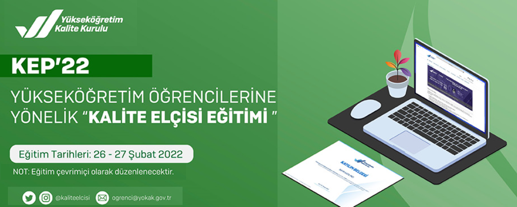 Yükseköğretim Kalite Kurulu (YÖKAK) Öğrenci Komisyonu tarafından, yükseköğretimde kalite güvencesi süreçlerine öğrenci katılımının sağlanması ve kalite kültürünün yaygınlaştırılması kapsamında yetkinlik kazandırmak amacıyla 26 Şubat-13 Mart 2022 tarihleri arasında “Kalite Elçisi Eğitim Programı (KEP’22)” düzenlenecektir.