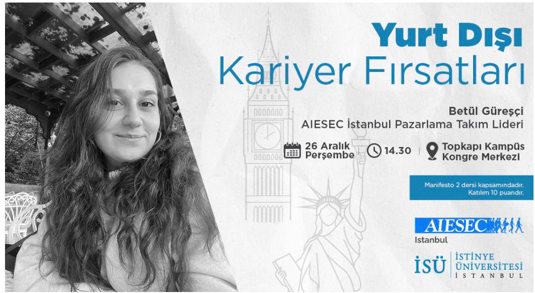 AIESEC İstanbul Pazarlama Takım Lideri Burcu Güreşçi'nin Yurt Dışı Kariyer Fırsatları konulu eğitimine davetlisiniz.