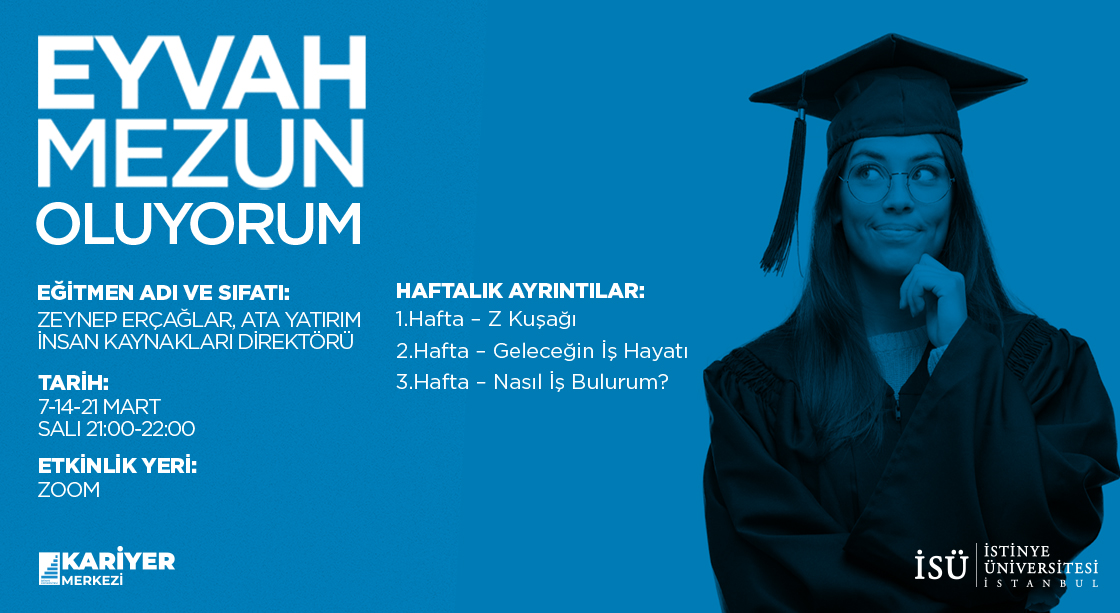 - Söyleşi İçeriği: Bir yandan mezun olmanın gururunu, diğer yandan iş hayatına atılacak olmanın korkularını yaşamaktayız. Yaşarken dünyanın en zor işi olan öğrenciliği terk etmek de kişiyi bir o kadar zorlamaktadır. Bu geçiş sürecinde karşılaşacaklarımızı, hayallerimizi ve gerçek dünyayı konuşacağımız söyleşimize katılmanıza memnun oluruz.