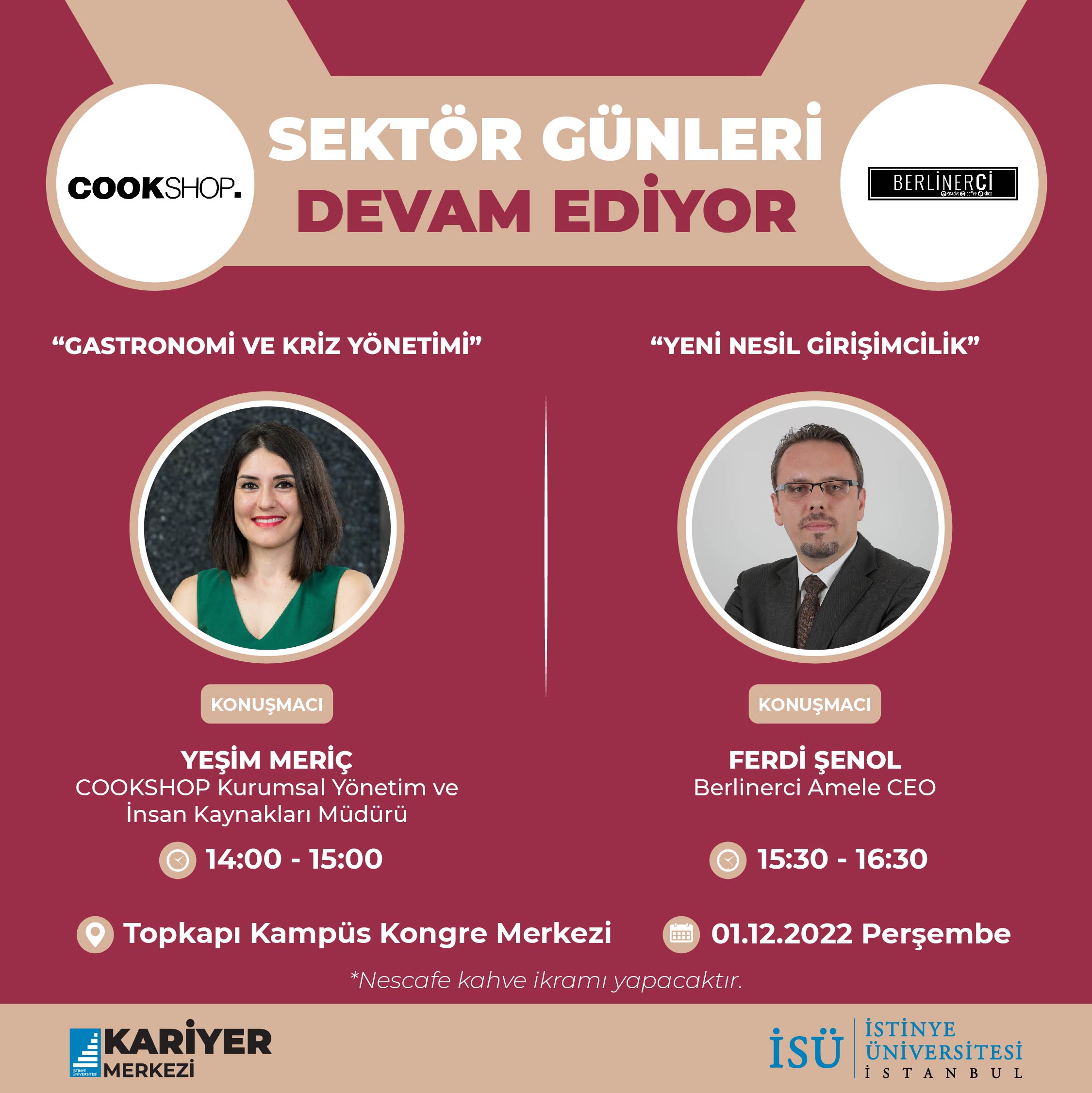 Sektör Günleri kapsamında gerçekleştirdiğimiz etkinliğin 5. oturumunda COOKSHOP Yeşim Meriç "Gastronomi ve Kriz Yönetimi" ve PROFOOD GROUP Ferdi Şenol "Yeni Nesil Girişimcilik" konulu seminer gerçekleştirilecektir. Tüm öğrenci ve mezunlarımızı bekliyoruz.