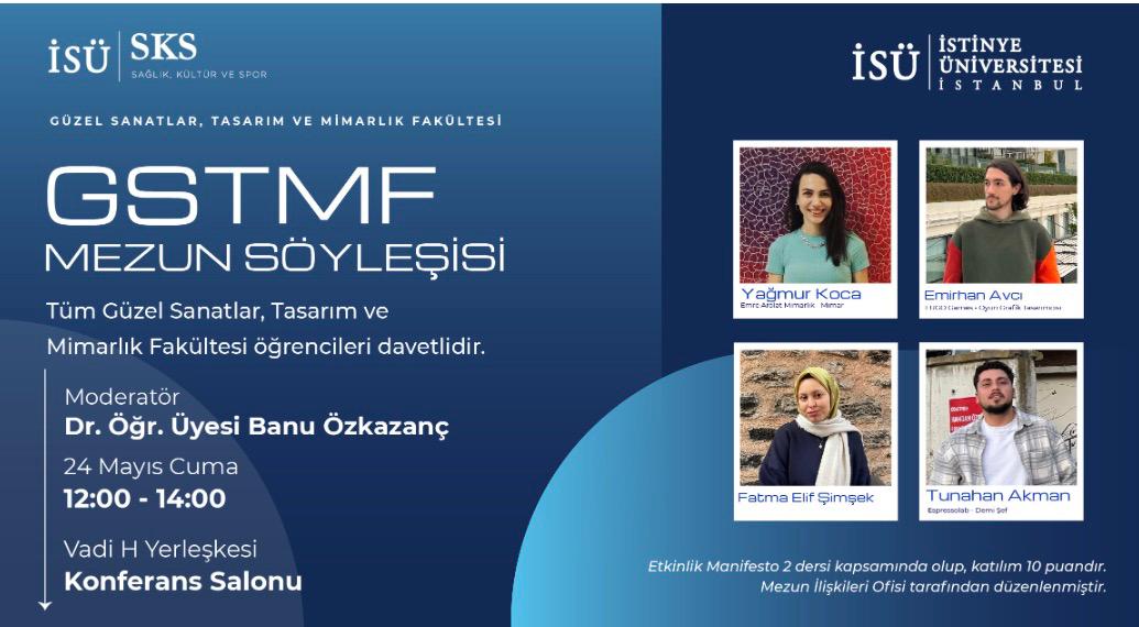 Mezun İlişkileri Ofisi tarafından düzenlenen Güzel Sanatlar, Tasarım ve Mimarlık Fakültesi Mezun Söyleşisi etkinliğine tüm GSTMF öğrencileri davetlidir.