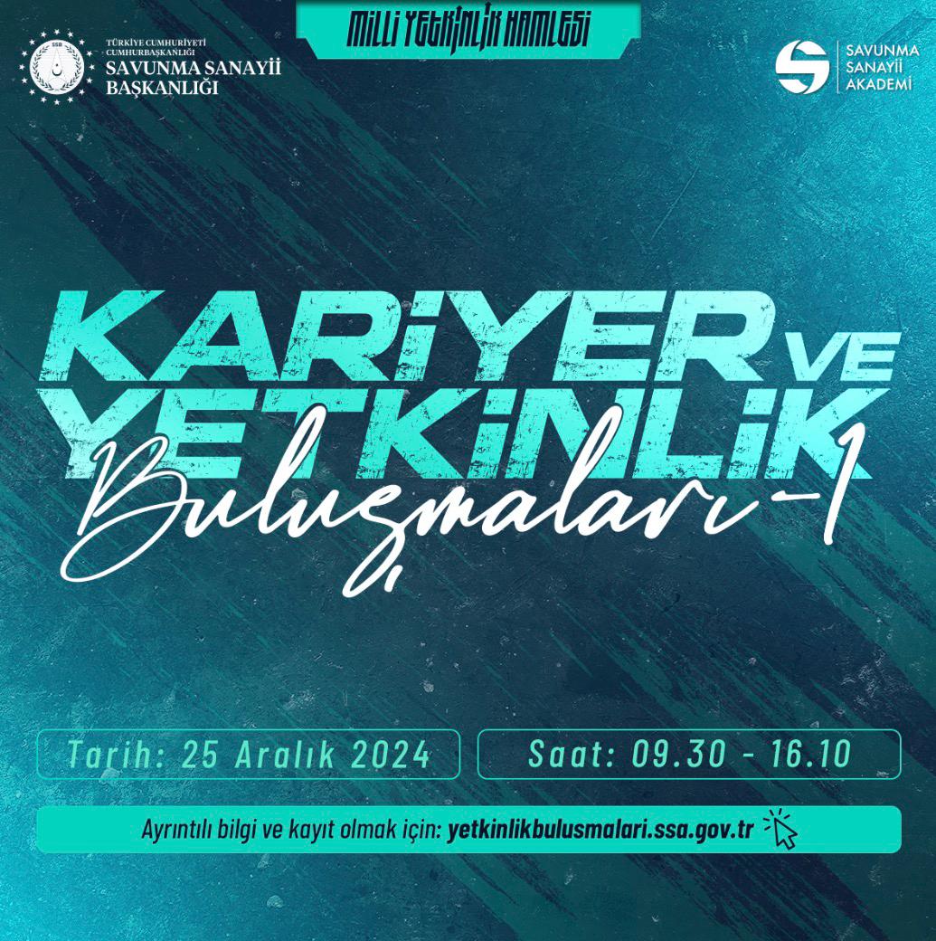 Milli Yetkinlik Hamlesi kapsamında, Savunma Sanayii Başkanlığı Savunma Sanayii Akademi tarafından hayata geçirilen çevrim içi etkinlikte, savunma sanayiinde kariyer fırsatları, geleceğin yetkinlikleri, dijitalleşme, teknoloji ve yapay zekâ gibi güncel ve önemli konular ele alınacak.