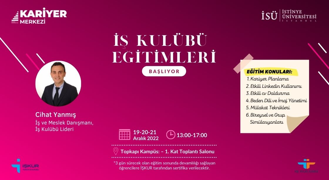 İş Kulübü eğitimleri başlıyor.Topkapı kampüste gerçekleşecek olan iş kulübü eğitimlerine katıl, İşkur tarafından verilen sertifikaya sahip ol..