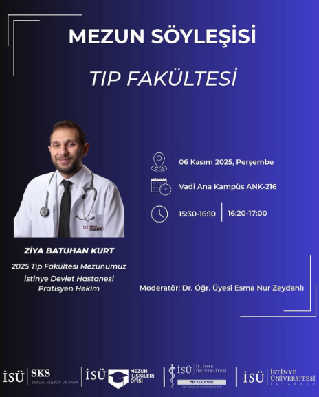 Kariyer Merkezi tarafından düzenlenen Mezun Söyleşisi kapsamında, 2025 Tıp Fakültesi mezunumuz Dr. Ziya Batuhan Kurt öğrencilerimizle bir araya geliyor.