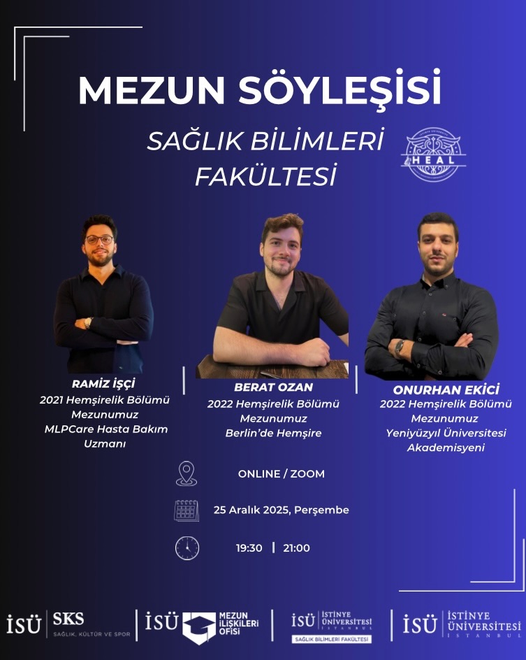 25 Aralık Perşembe günü, HEAL Kulübü iş birliğiyle hemşirelik öğrencilerimiz için düzenlenen online mezun söyleşimizde alanında aktif olarak çalışan mezunlarımızla bir araya geliyoruz.