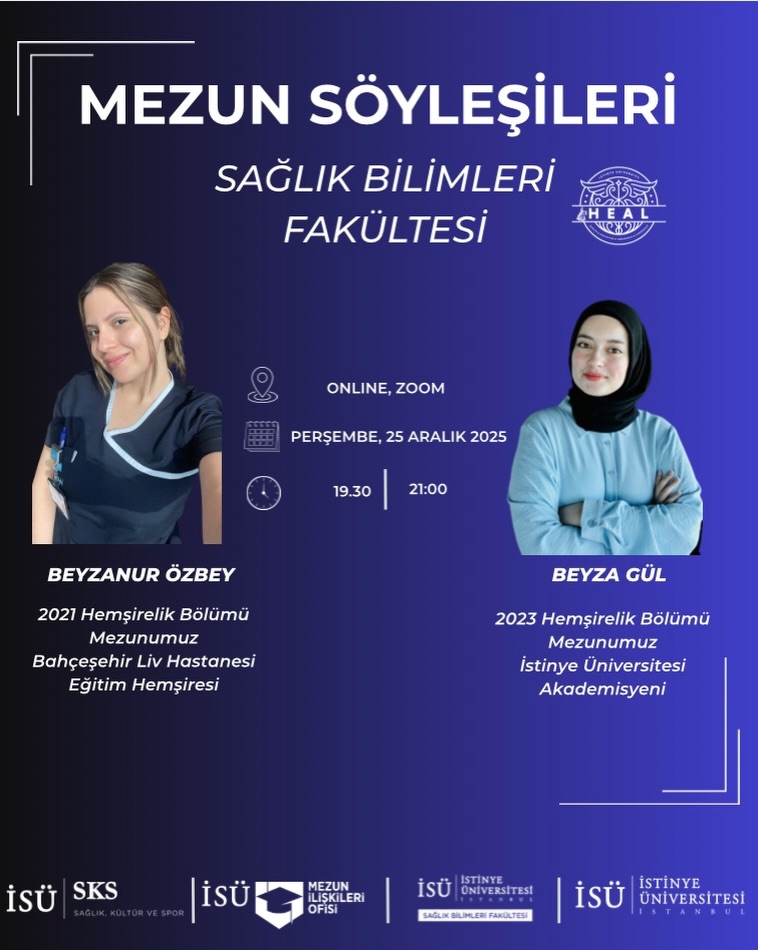25 Aralık Perşembe günü, HEAL Kulübü iş birliğiyle hemşirelik öğrencilerimiz için düzenlenen online mezun söyleşimizde alanında aktif olarak çalışan mezunlarımızla bir araya geliyoruz.