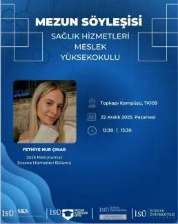 Sağlık Hizmetleri Meslek Yüksekokulu’nda düzenlenen Mezun Söyleşisi, 2025 yılı Eczane Hizmetleri Bölümü mezunu Fethiye Nur Çınar’ın katılımıyla 22 Aralık 2025 tarihinde Topkapı Kampüsü TK109 salonunda gerçekleştirildi. 🎓