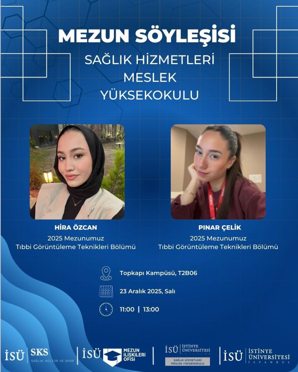 Sağlık Hizmetleri Meslek Yüksekokulu tarafından düzenlenen Mezun Söyleşisi, 2025 yılı Tıbbi Görüntüleme Teknikleri Bölümü mezunları Hira Özcan ve Pınar Çelik’in katılımıyla 23 Aralık 2025 tarihinde Topkapı Kampüsü T2B06 salonunda gerçekleştirildi. 🎓