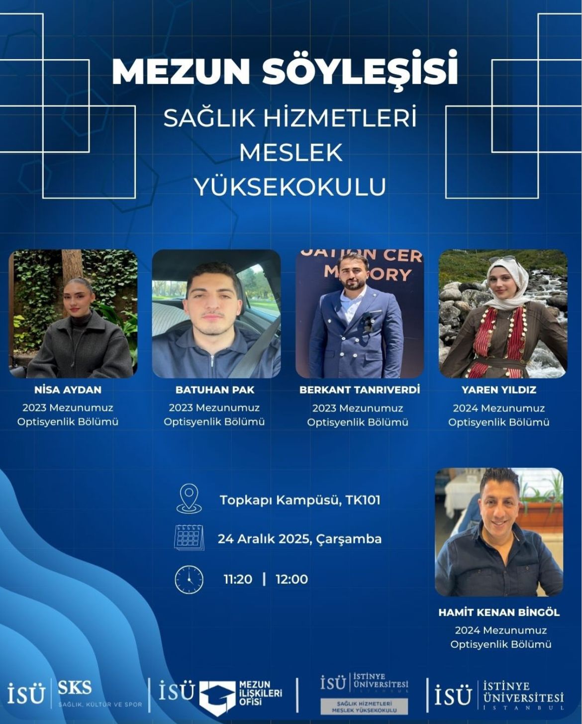 Sağlık Hizmetleri Meslek Yüksekokulu tarafından düzenlenen Mezun Söyleşisi, Optisyenlik Bölümü mezunlarımız Nisa Aydan, Batuhan Pak, Berkant Tanrıverdi, Yaren Yıldız ve Hamit Kenan Bingöl’ün katılımıyla 24 Aralık 2025 tarihinde Topkapı Kampüsü TK101 salonunda gerçekleştirildi.