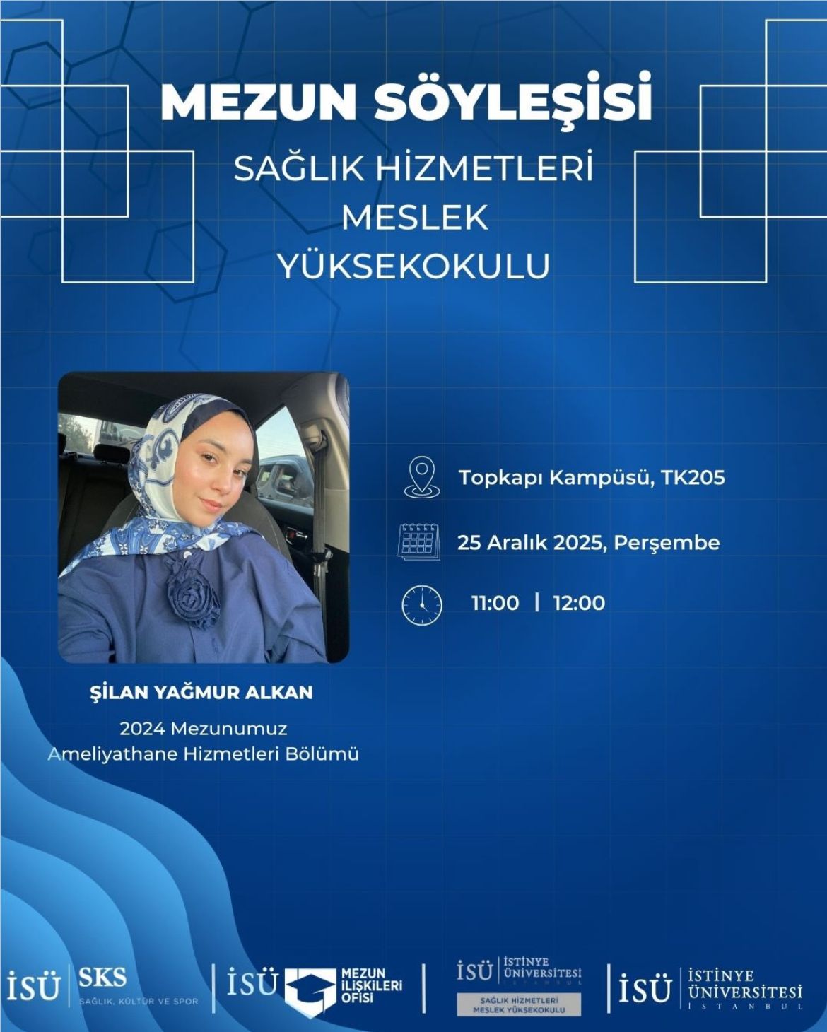 Ameliyathane Hizmetleri Bölümü 2024 mezunumuz Şilan Yağmur Alkan’ın katılımıyla düzenlenen söyleşi, 25 Aralık 2025 tarihinde Topkapı Kampüsü TK205 salonunda yapıldı.