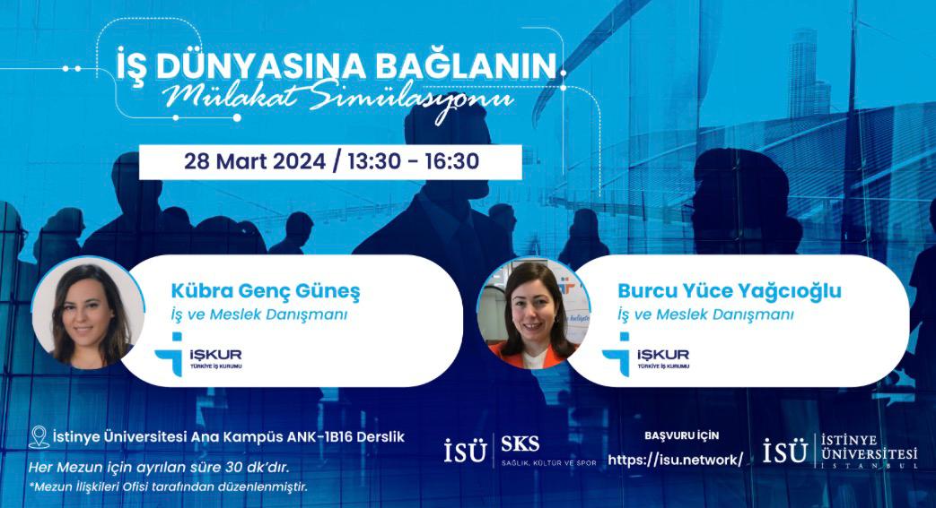 İŞKUR ile Mülakat Simülasyonu gerçekleştirmek için https://isu.network/events/511 adresi üzerinden başvurunuzu yapabilirsiniz.