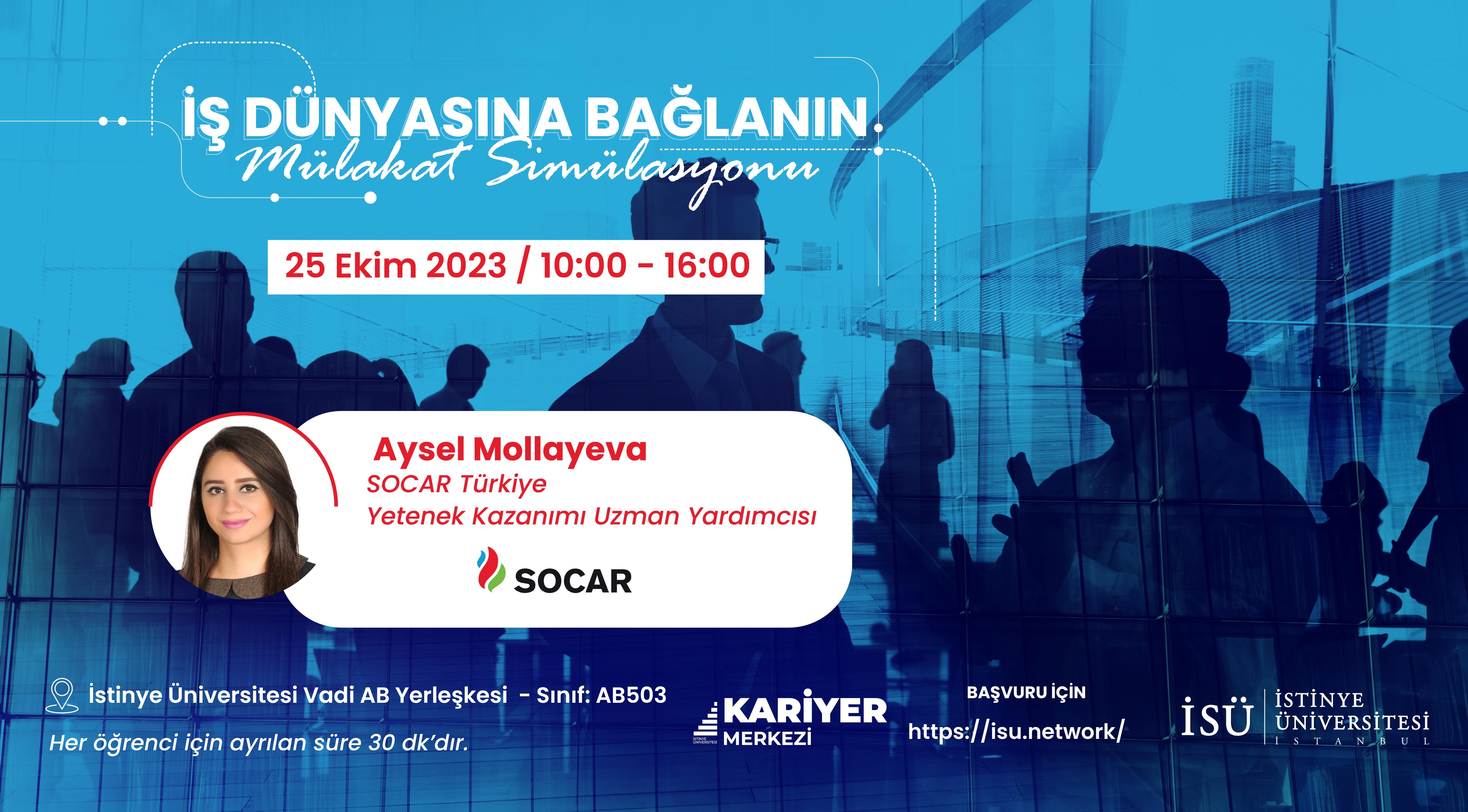 SOCAR Türkiye’den Aysel Mollayeva ile Mülakat Simülasyonu gerçekleştirmek için aşağıdaki link üzerinden başvurunuzu gerçekleştirebilirsiniz.