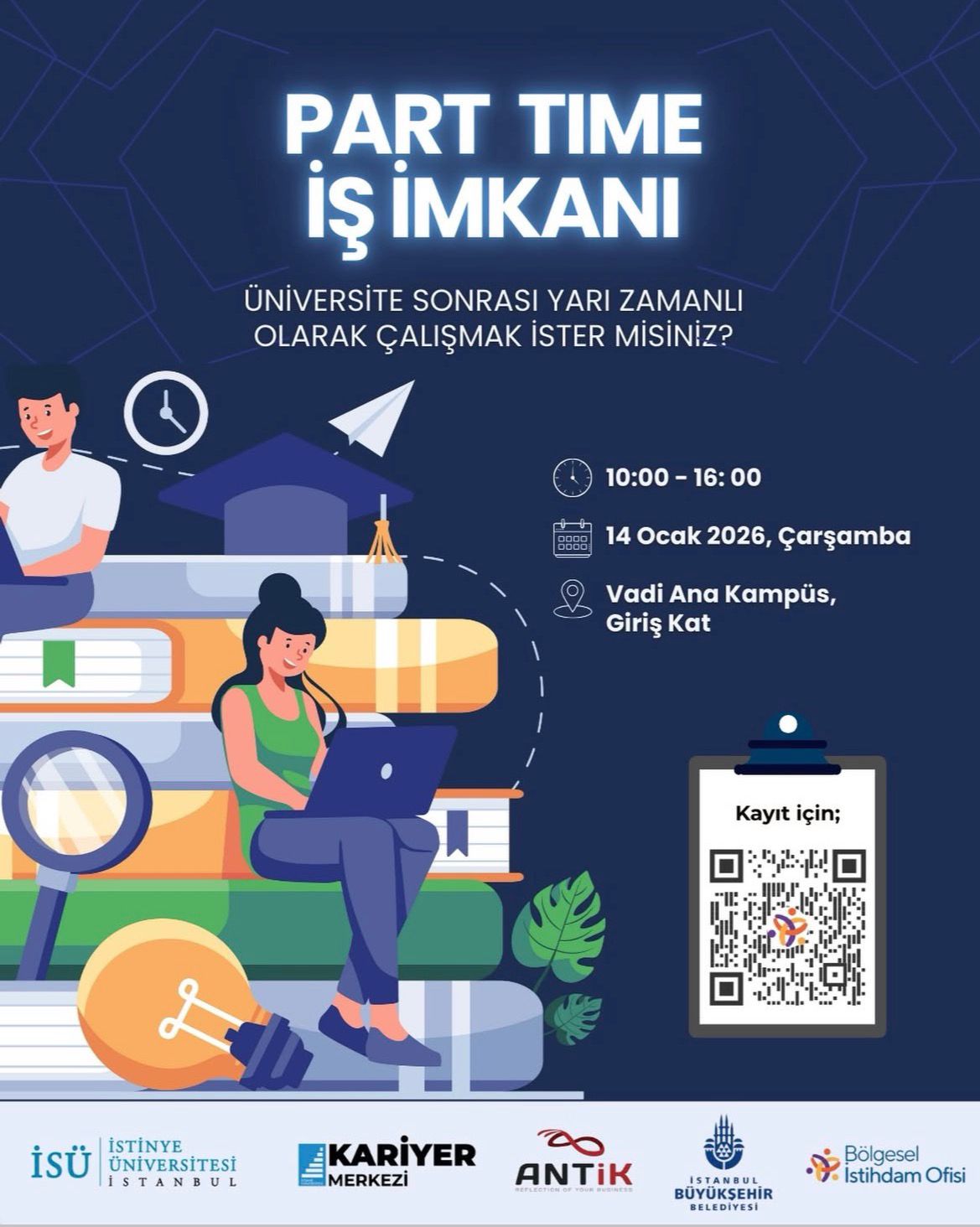 Kariyer Merkezi ve Bölgesel İstihdam Ofisi iş birliğiyle saat 10:00 - 16:00 arasında düzenlenen "Part Time İş İmkanı" etkinliğinde, öğrencilerimiz iş dünyasıyla doğrudan temas kurma ve kayıt yaptırma şansı buldular. Kariyer basamaklarını şimdiden tırmanmaya başlayan gençlerimiz için oldukça verimli bir gün oldu 📚✨.