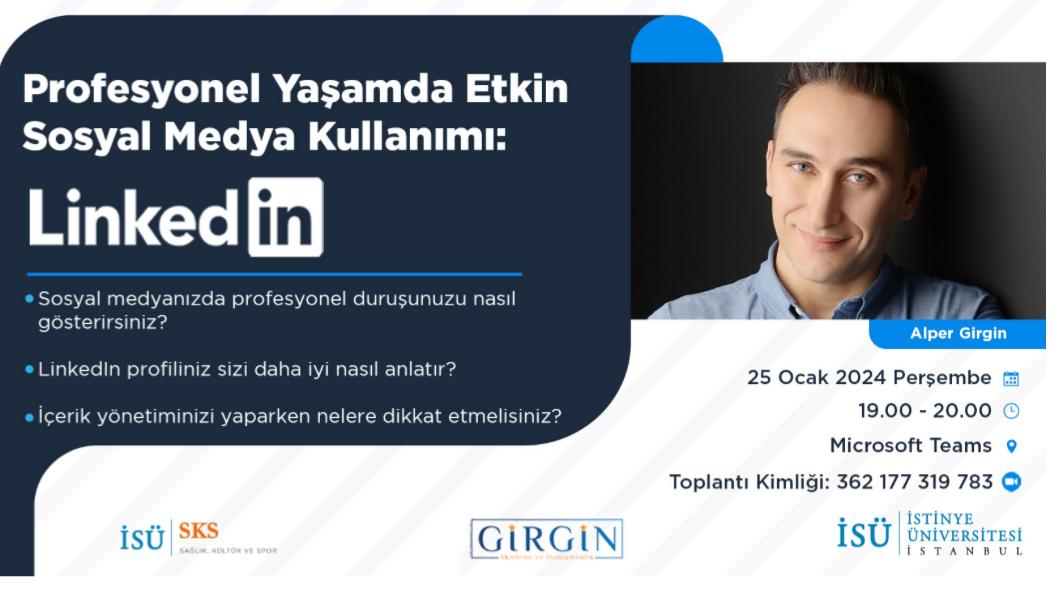 Yetenek Koçu ve İK Danışmanı Alper Girgin'in anlatımıyla, "Profesyonel yaşamda Etkin Sosyal Medya Kullanımı: LinkedIn" etkinlik linkine https://isu.network/events/457 adresi üzerinden ulaşabilirsiniz.