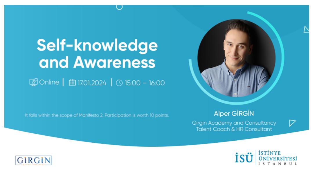 You can reach the Talent Coach & HR Consultant Alper Girgin's training “ Self-knowledge and Awareness” participation link from https://isu.network/events/452.