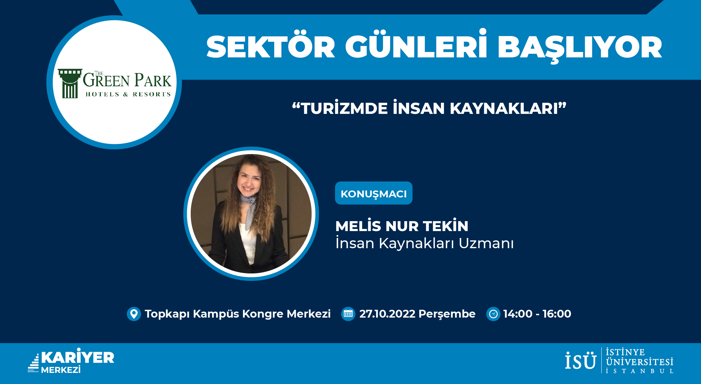 Sektör Günleri kapsamında gerçekleştirdiğimiz etkinliğin 2. oturumunda The Green Park Hotel Melis nur Tekin "Turizmde İnsan Kaynakları" konulu eğitim gerçekleştirilecektir.Tüm öğrenci ve mezunlarımızı bekliyoruz.