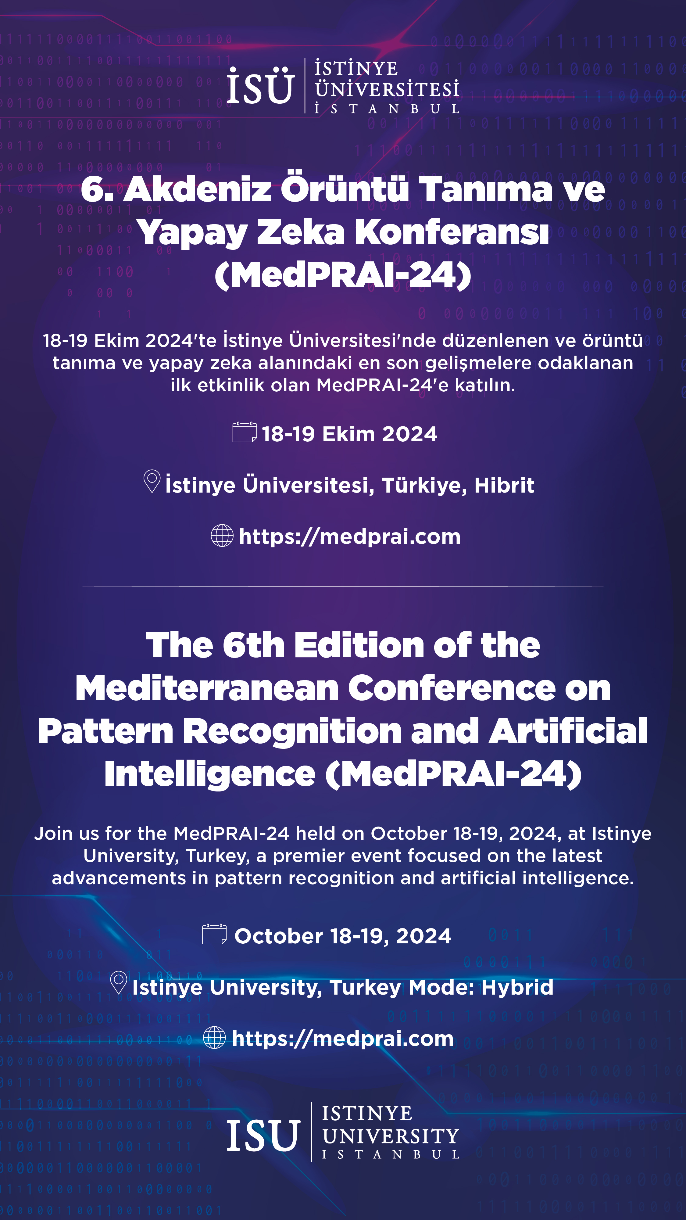 İstinye Üniversitesi Mühendislik ve Doğa Bilimleri Fakültesi tarafından düzenlenen 18-19 Ekim 2024 tarihlerinde Vadi H Yerleşke Konferans Salonunda gerçekleştirilecek 6. Akdeniz Örüntü Tanıma ve Yapay Zeka Konferansı (MedPRAI-24) etkinliğine davetlisiniz.