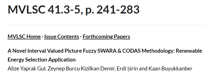 “A Novel Interval Valued Picture Fuzzy SWARA & CODAS Methodology: Renewable Energy Selection Application” başlıklı makale Journal of Multiple-Valued Logic and Soft Computing dergisinde yayınlanmıştır.