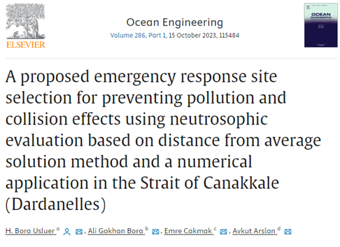 “A proposed emergency response site selection for preventing pollution and collision effects using neutrosophic evaluation based on distance from average solution method and a numerical application in the Strait of Canakkale (Dardanelles)” başlıklı makale Ocean Engineering dergisinde yayınlanmıştır.