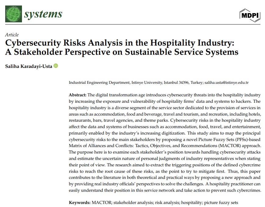 “Cybersecurity Risks Analysis in the Hospitality Industry: A Stakeholder Perspective on Sustainable Service Systems” başlıklı makale Systems dergisinde yayınlandı.