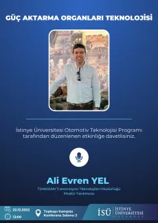 İstinye Üniversitesi Otomotiv Teknolojisi Programı tarafından 22 Aralık Perşembe günü saat 13.00'da Topkapı Kampüs Konferans Salonu 2'de gerçekleşecek etkinliğe davetlisiniz.