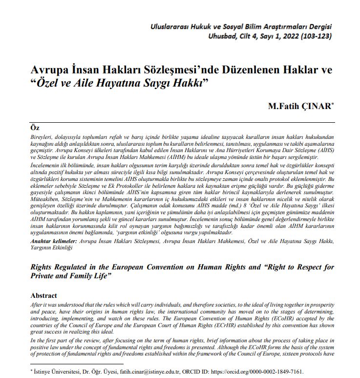 Meslek Yüksekokulu Adalet Programından Dr. Öğr. Üyesi Mehmet Fatih ÇINAR'ın Uluslararası Hukuk ve Sosyal Bilim Araştırmaları dergisinde "Avrupa İnsan Hakları Mahkemesi'nde Düzenlenen Haklar ve "Özel ve Aile Hayatına Saygı Hakkı"" konulu makalesi yayımlanmıştır. Hocamızı tebrik eder akademik çalışmalarında başarılar dileriz.